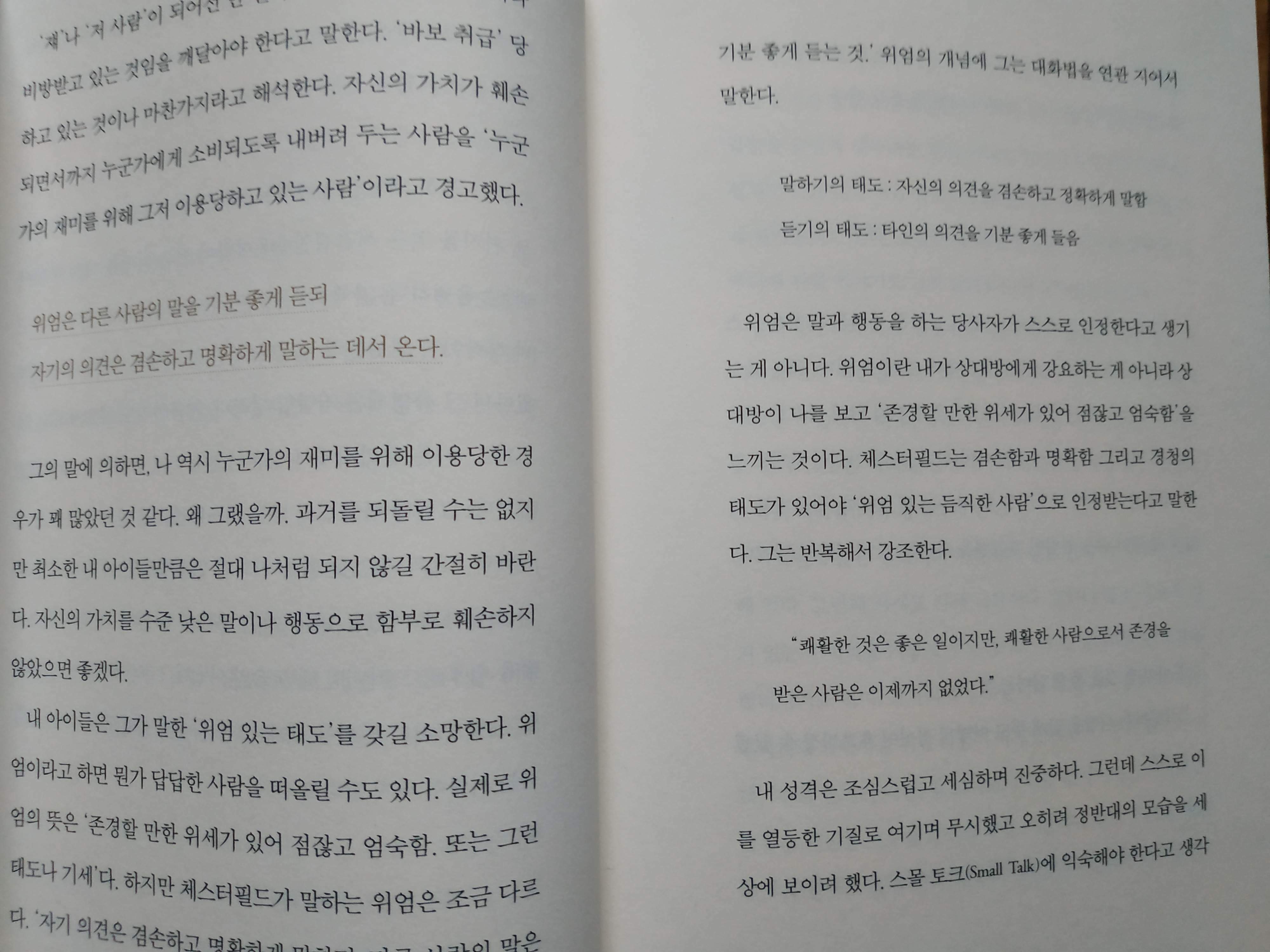 -위엄은 다른 사람의 말을 기분 좋게 듣되 자기의 의견은 겸손하고 명확하게 말하는 데서 온다.