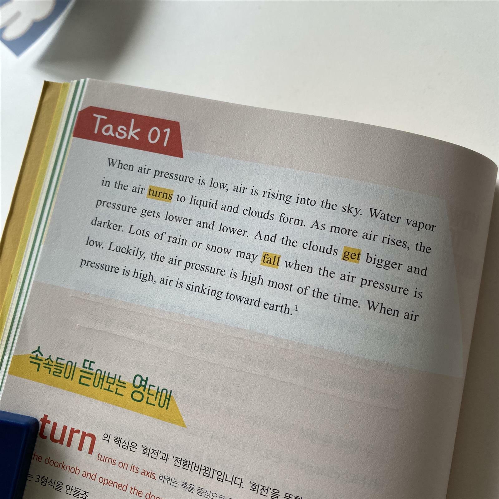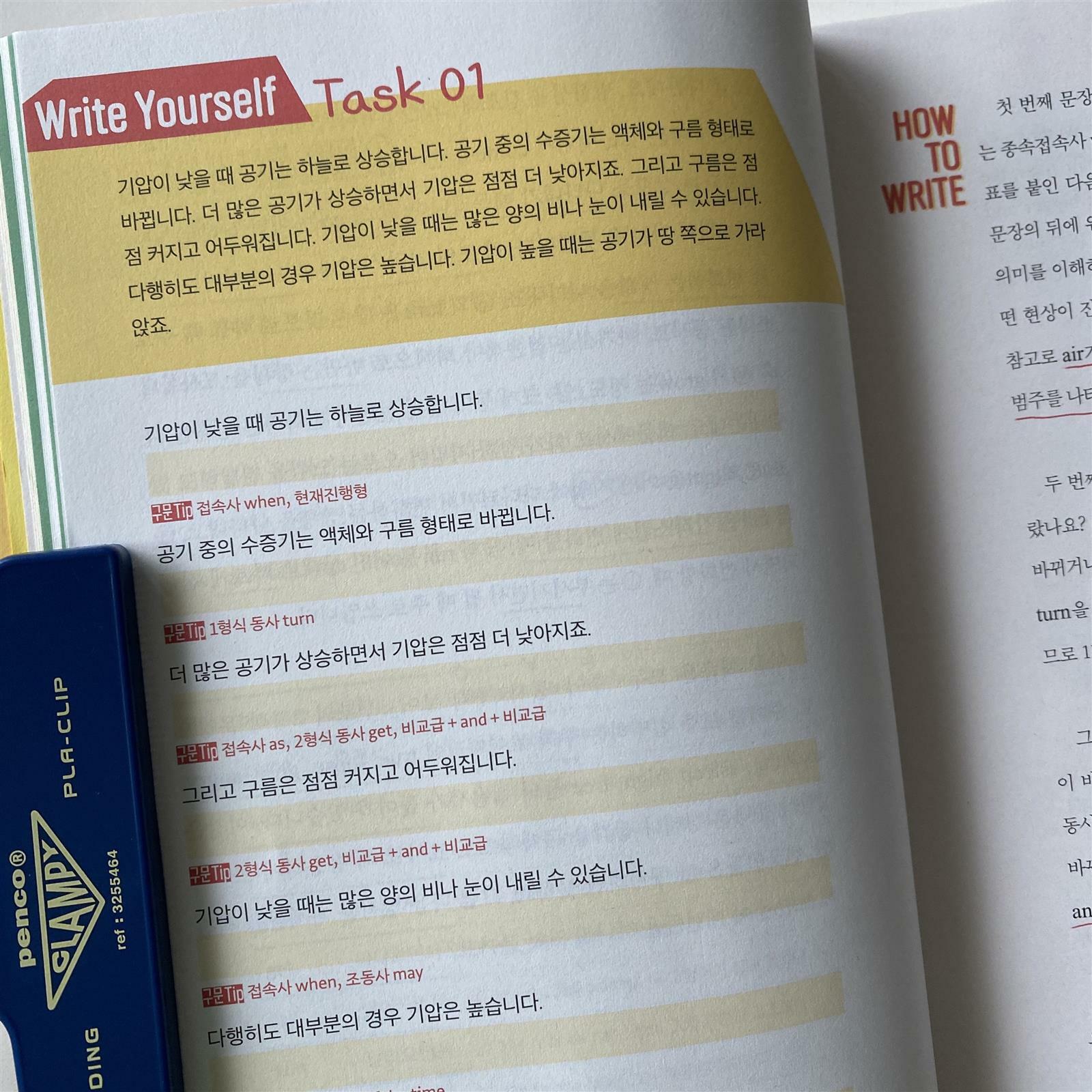 이 책은 특히 토플이나 토익 라이팅 등의 시험을 준비하실 분들께 유용하다는 생각이 들었어요. 예문이 일상적인 회화 문장이라기 보다는 조금은 전문적인 내용이 들어가 있거든요(맨 처음 Task 주제가 '기압 변화'더라고요). 그렇기 때문에 해당 시험을 처음 준비하시는 분들, 또는 유학 준비를 하고 싶은 학생 분들이 특히 보면 좋을 것 같아요!