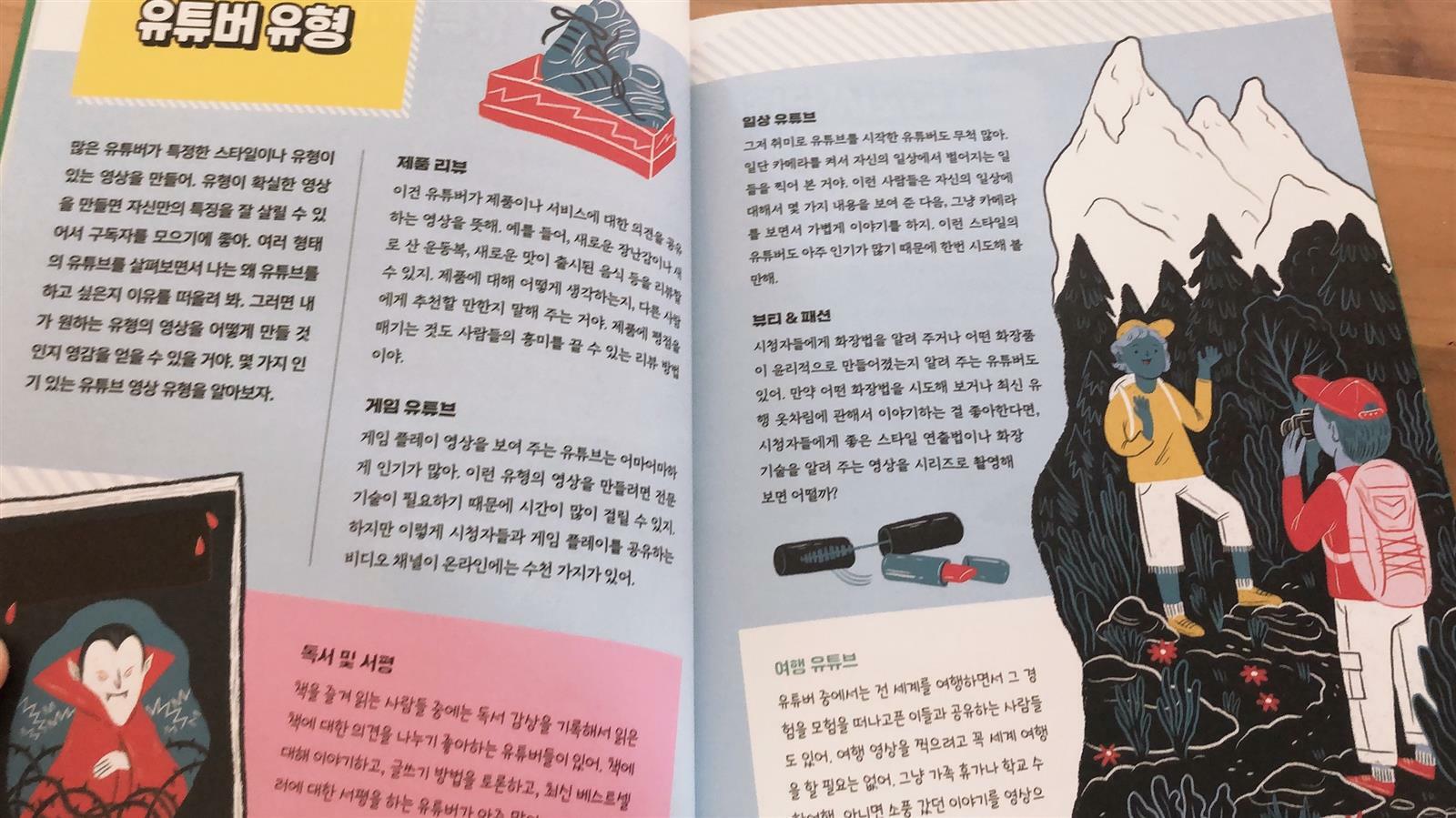 #유튜버 #유투브 #장래희망직업 유튜버에 대해서 궁금하다면....나도 유튜버가 되고 싶다면...?? 지금이 바로 도전 할때!! 내가 하고 싶은 일 유튜버에서는 지금 바로 영상을 찍어서 올려도 될만큼 여러가지 방법과 유형의 유튜버 가 어떻게 되는지 잘 안내 되어있다. 유튜버의 유형으로는 아이들이 좋아하는 장난감을 소개하는 등의 리뷰를 하는 유형이 있고(아직 까지도 가장 핫한것 같지만), 우리집 아들 같은 경우엔 게임유튜버(?)가 되는게 꿈이며 그중에서로 브롤링(?) 겜브링인가?? 무튼 매일 영양가 있는 영상을 보라고 하는 나와 우리 아들이 항상 대립되는 시간이다. 어떤 유튜버(종이접기)는 아이들에게 너무 야단 치지 말고 가능성을 보 라고 하더라!! 자기도 어릴때 종이접기 엄마가 엄청 싫어 했는데...큰 돈 은 아니지만 수입이 되는 ...직업이 될거라고는 생각도 못했다고!! 그러고 보면 참을성 없고 참지 못하는 부모가 잘 못인것 같기도 하지만... 그래서 관심 있는 아들에게 게임만 잘하는것이 게임유튜버의 일이 아니 라는걸 알려주고 싶어 이책을 선택했다