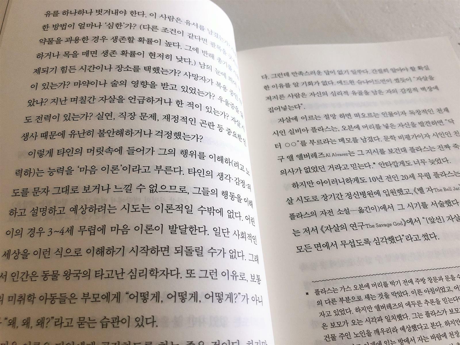 저자는 지적 호기심이 죽고 싶다는 생각을 떨쳐 버리게 했지만... 사람마다 방법은 다를듯 합니다.
