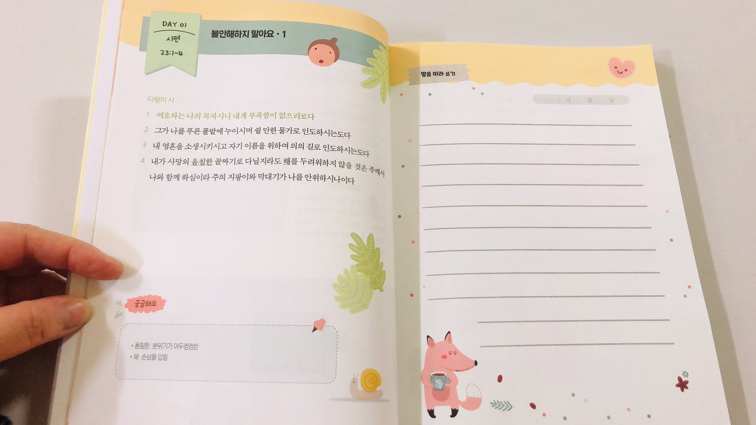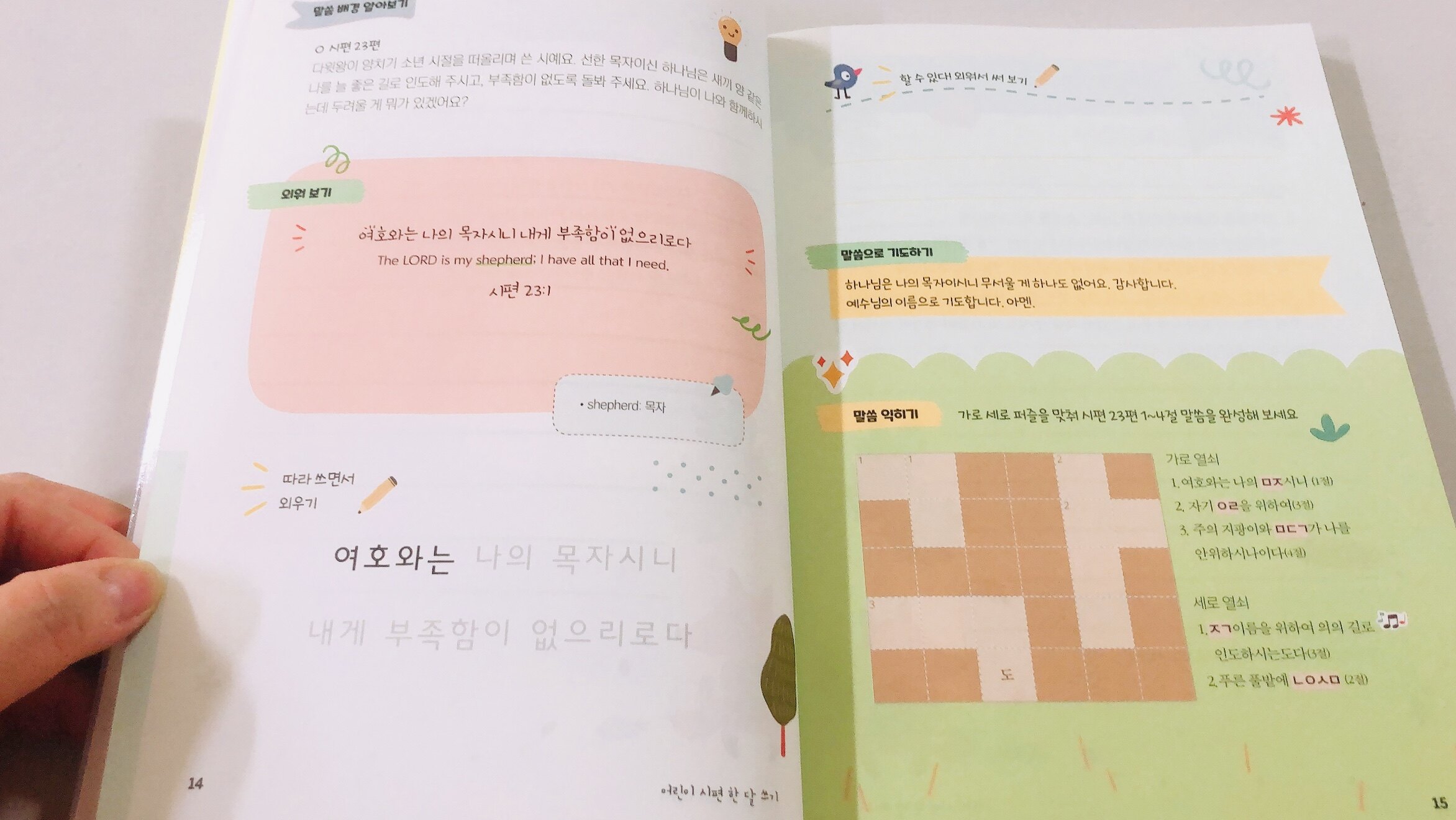 아이들에게 성경을 가까이 하게 하는 방법....뭐가 있을까?? 실샐활에서 거부감 없이 아이들이 접할수 있는 방법은 없을까?? 참 고민 고민 해도 아직도 어떤게 젤 우리 아이들에게 맞는지 잘은 모르겠지만 하나 하나 기회가 되는대로 적용해보는 방법뿐. 내가 처음 성경을 읽어 보겠다 결심 했을때 주변에서 “시편”을 먼저 읽어 보라는 권유를 많이 받았었죠. 또 , 여러번 창세기부터 시도 했지만 실패 한적도 많아서 결국으 시편, 잠언부터 시작 했던것 같다. 하루에 시편 1-4절 정도 따라쓰고쉬운성경이 아니라 말씀중 아이들이 어려워 하고 이해하기 힘든 말들은 따로 설명해두기도 했어요. 또, 그날 읽고 따라쓰게 되는 말씀의 배경도 알수 있어서 말씀을 이해하고 어떤 상황에서 어떤 마음이었는지 더욱 전달이 잘되는긋 하다말씀중 한구절 정도는 함께 암송을 해보는것도 좋은것 같다. 전체적으로 암송하는것도 해봤지만 시간이 지날수록 지겨워하고 많은량을 암송해야 한다는 부담감으로 거부감을 들어내더라 ㅠ 한절 정도니 영어성경으로 함께 암송을 해도 좋을듯하다. 말씀으로 기도하고 익힌 말씀을 퍼즐로 다시 한번 익히는 코너도 있다. 뒤쪽으로 넘겨보면 낱말퍼즐 외에도 지겹지 않게 여러 방법으로 익히기를 도와주고 있다. 개인적인 생각으로 아이와 큐티북으로 사용해도 좋을듯하다. 서평이벤트에 당첨되어 도서 무료 제공 받아 쓰여진 후기입니다