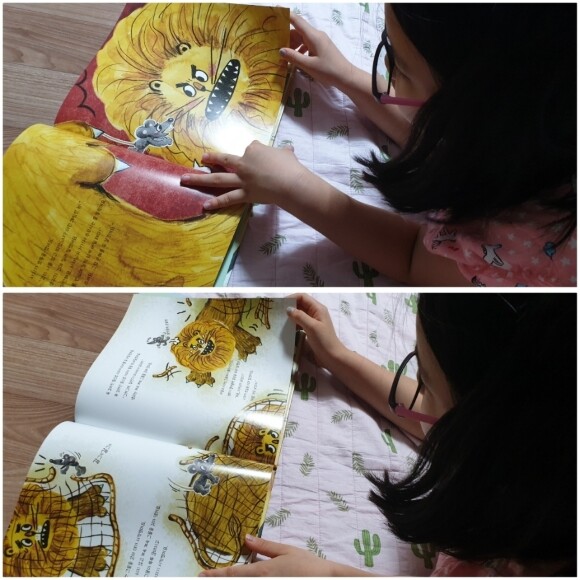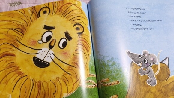 잘 아는 내용이지만 재밌게 읽었던것 같아요. 우리 작은애는 그림도 귀엽다면서 몇번을 보더라구요. 작은 생쥐여도 사자를 도울수 있는 방법이 있다는게 기억에 난다고 하네요. 주제를 정확하게 짚어내는 우리 둘째였답니다. 뿌듯~^^