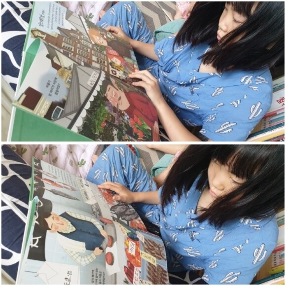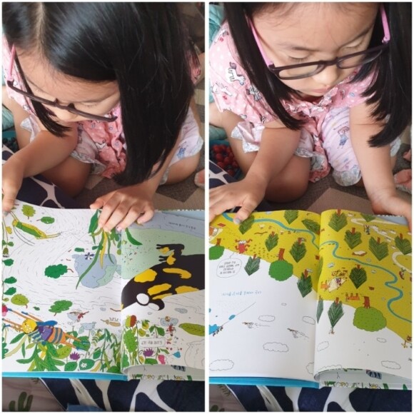 책을 다 본뒤에 알게 된 사실이에요. 강아지 친구가 시장 곳곳을 같이 다녔다고 하네요. 아이들과 뒤늦게 다시 찾아볼수 있었답니다. 강아지 친구가 어디에 숨어 있었는지 함께 찾아보세요~~