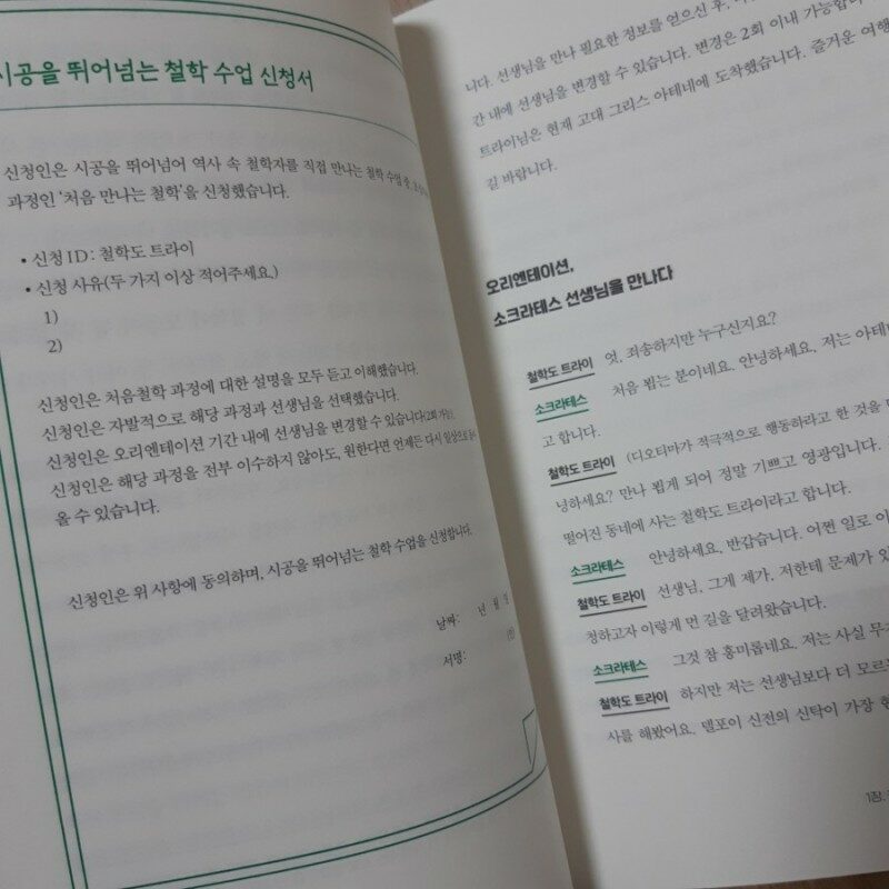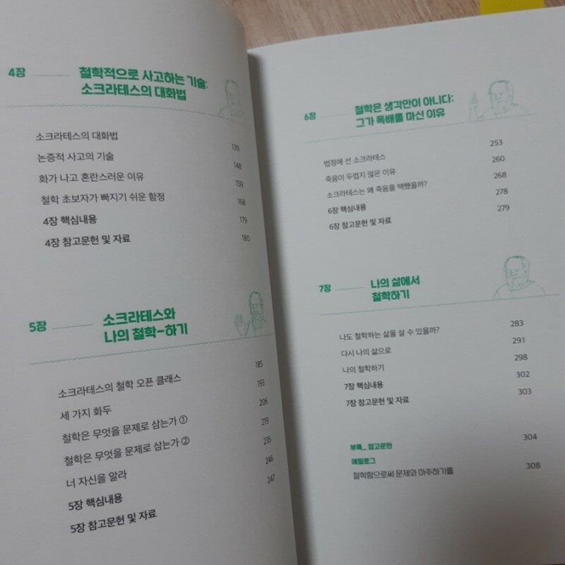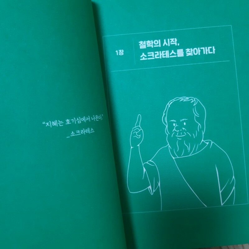 A. 이 책을 읽기 전에는 소크라테스가 남긴 대화나 글로 인생의 철학을 풀어가는 책이라고 생각했습니다만, 오히려 소크라테스의 삶을 함께 천천히 되짚어가는 책에 가까웠습니다. 제가 예상했던 편집은 “소크라테스는 이렇게 저렇게 말했다” -> 그래서 “우리는 인생을 이렇게 저렇게 살아야 한다”는 느낌의 편집이었죠. 하지만 이 책은 제 예상과 달랐습니다. 저와 같이 인생에 대해 고민을 하는 철학도 트라이를 등장시켜 소크라테스와 소크라테스 주변 인물들의 이야기를 들어보죠. 소크라테스는 철학도 트라이의 질문에 적절히 답해주면서 끊임없는 질문을 던집니다. 그리고 그 질문을 통해 인생의 철학적 진리를 이끌어내죠. 철학도 트라이가 깨달음을 얻는만큼 독자 또한 인생의 철학을 조금씩 깨달아가게 됩니다.