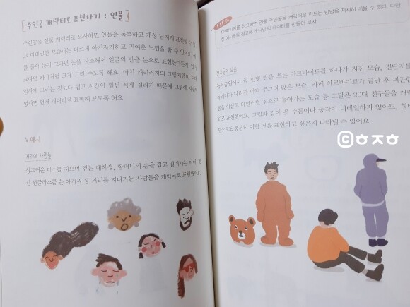 사실 처음에 그림을 시작할 때, 사람을 그리라고 하면 막막하죠. 그래서 작가는 초보자도 쉽게 그릴 수 있는 인물들 혹은 동물들을 예시로 보여줍니다. 누구라도 쉽게 그릴 수 있는 그림으로 말이죠.