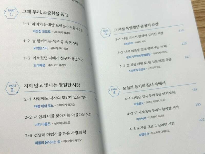 이 책에는 우리에게 굉장히 익숙할 애니메이션들이 수록되어 있습니다. 지브리, 디즈니 애니메이션을 비롯한, 아이들보다는 어른들에게 더 익숙할 그런 유명 애니메이션들 말이죠.