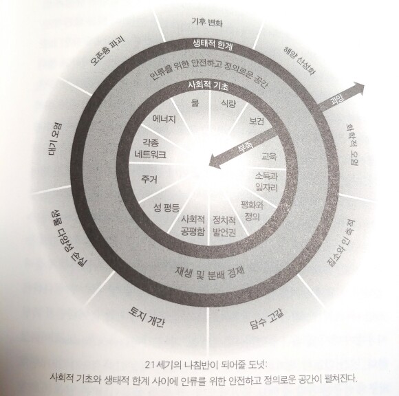 환경의 한계가 되는 외부 고리 사이에 인류를 위한 안전하고 정의로운 공간인 도넛을 만들기 위한 새로운