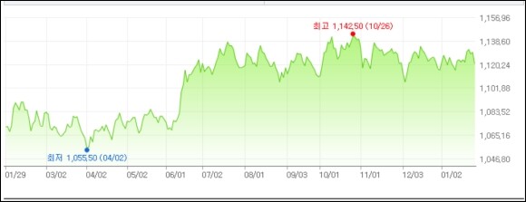 1년간 가장 높았던 1,142.5원(18년10월26일)보다는 21.5원이 낮은 상태이지만, 작년 4월 2일의 1,055.5원에 비하여는 무려