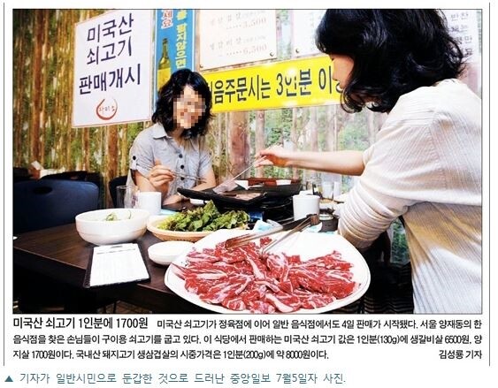 먹는 장면이 묘사되어 있었고, 사진 설명으로 미국산 쇠고기가 일반 음식점에서도 판매가 시작됐다는 내용이었다.