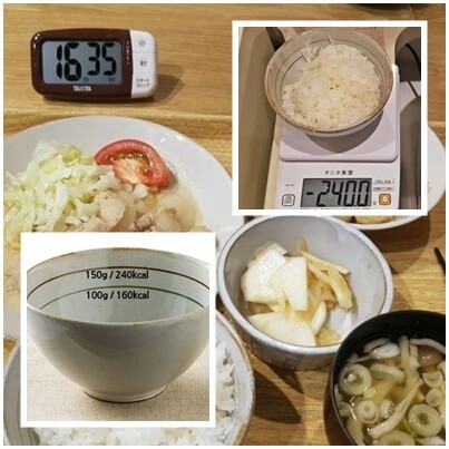 밥량을 재는 저울이 있고, 식사를 시키면 스톱워치를 제공하여 충분하게 잘 씹으면서 식사를 하도록 시간(20분이 적당시간이라고 한다,,난 10분도