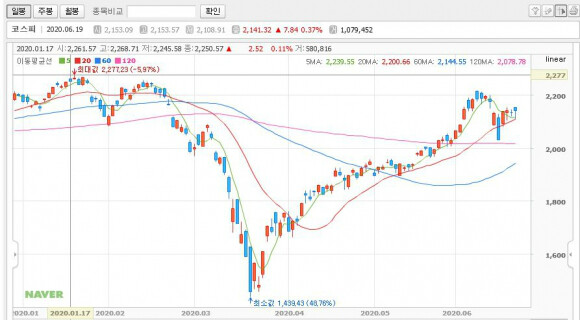 코스피의 경우 1,900~2,250선을 횡보하던 중 코로나19로 인하여 1439(2020년 3월 19일)포인트까지 폭락하였다 지난 6월초에는 2,200선까지 올라오는 확연한 V자형 회복세를 보여주었다.
