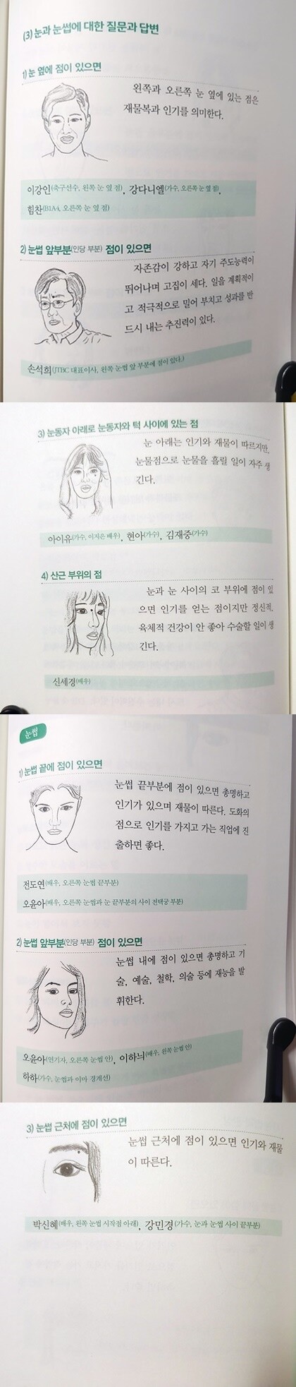 이처럼 눈썹과 점의 위치만으로도 여러가지 관상이 나올 수 있다고 하니까, 눈의 크기와 모양, 눈썹의 색깔과 모양, 눈동자의 형태와 색깔 등 눈 하나로만 해도 수많은 조합이 나올 수 있다는 것이니까 우리가 전문가가 되기는 쉽지 않을 것으로 보인다.