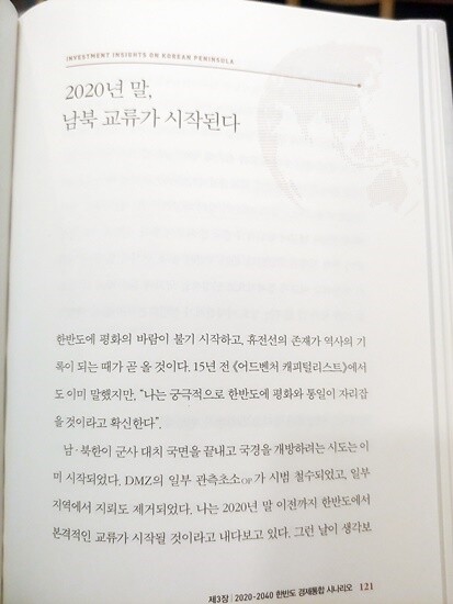전 세계에서 사회주의 체체를 유지하고 있는 나라들 중 미국과 수료하지 않은 유일한 나라인 '북한'이 5년 이내에 큰 변화의 중심에 서게 될 것이고, 이러한 변화는 한국과 북한 두 나라 모두에게 지금까지 없던 투자 기회를 제공할 것이라는 것이다.