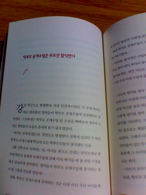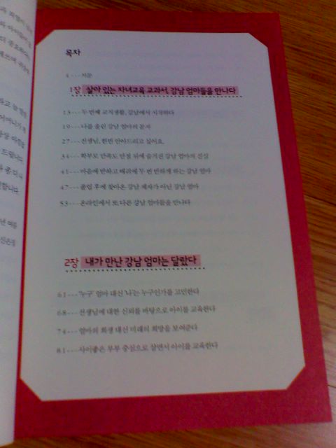 이 책은 총 5장으로 구성되어 있고 앞 부분은 우리가 그동안 매스컴이나 책으로 만났던 강남엄마들이 아닌 강남 엄마들의 다른 모습을 선생님의 학교 생활 속에서의 에피소드로 보여주고 있어요.