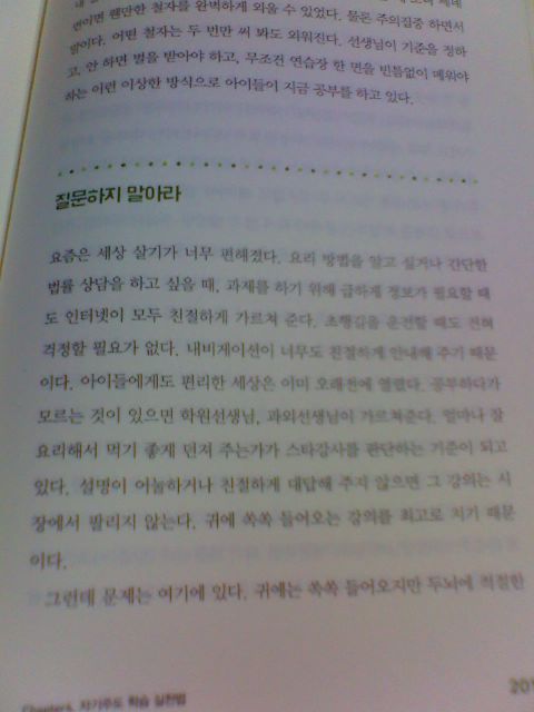 '친절한 설명은 독이다' 부분을 읽으면서 정말 제가 우리딸과 같이 공부하면서 이것 하나는 잘 한 것 같다는 생각이 들었어요. 1학년때부터 문제집을 풀면서 공부를 했는데 조금 어려우면 조금 문장이 길면 질문을 자꾸 하더라구요. 그래서 제가 설명을 주주장창 해주기 시작하니 우리 딸은 그냥 옆에서 듣기만 하고 제가 문제를 풀고 있더라구요. 이건 아니다 싶어 스스로 풀게끔 정말 모르면 한 문장씩 끊어서 의미를 살펴보게 했더니 이제 3학년쯤 되니 왠만한 문제는 스스로 해결할려는 습관이 잡히더라구요.