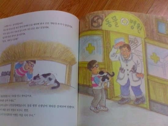 그러던 어느 날 고양이가 병이 나고 약을 먹이게 되고 다시 석이의 고양이 '치타'는 씩씩해졌어요.