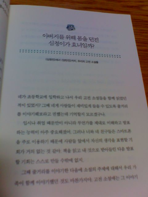 이 책은 고전을 처음 접했던 저자의 아들과의 대화 형식으로 이야기가 전개되어 나가고 있어요. 그래서 정말 아버지가 아들에게 이야기를 해 주듯이 우리의 고전과 세계 고전을 간략한 줄거리를 요약해 주면서 고전에 담겨진 깊고 풍부한 의미를 설명해 주고 있어요.
