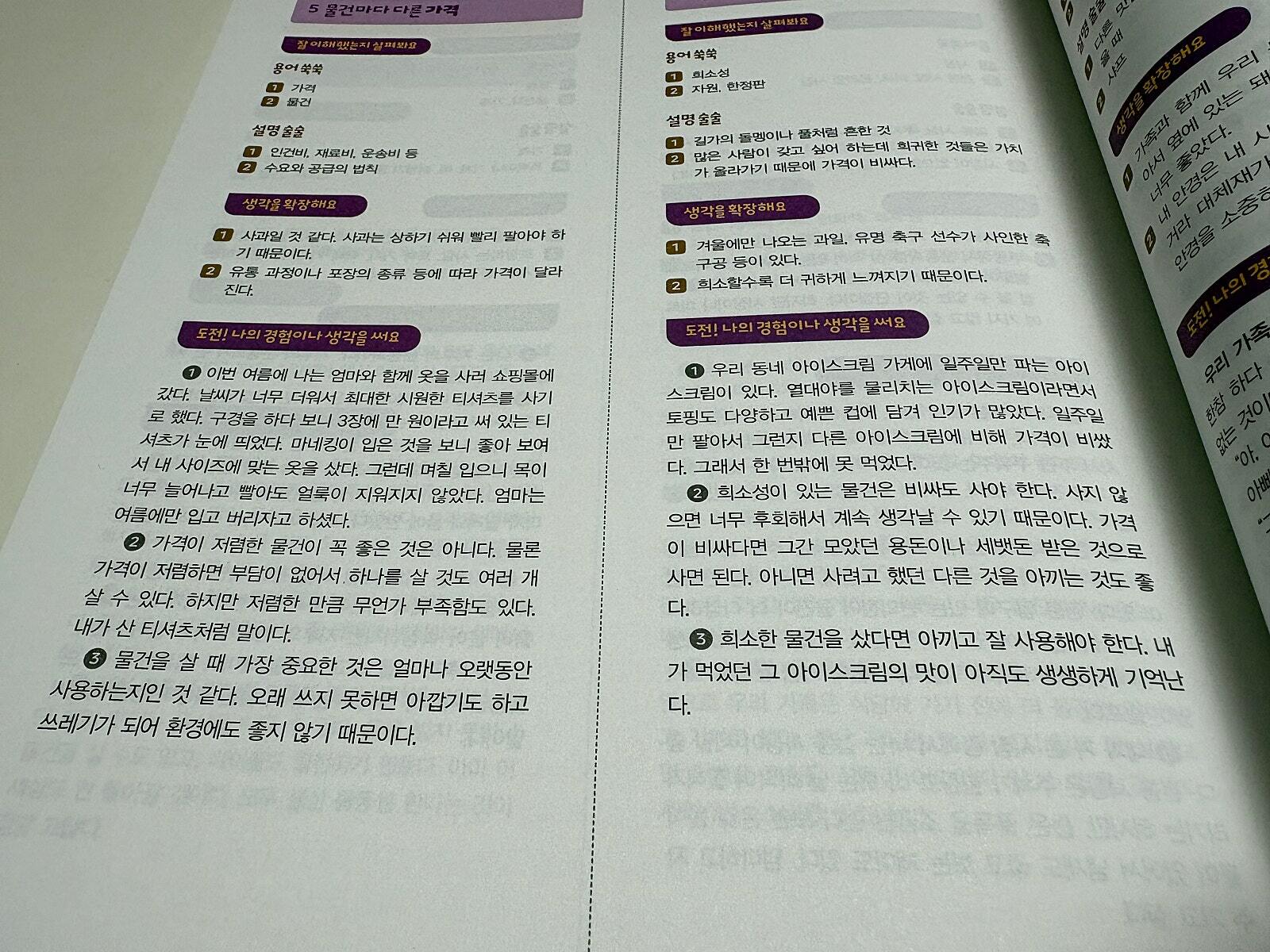 그런데 이 교재는 경제 개념을 생활 속 이야기로 이해하고 자신의 생각을 글로 정리하게 만드는 구조라서 훨씬 실용적이었어요.