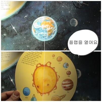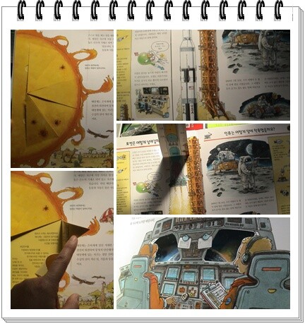 왜?왜?왜? 어린이 과학책 시리즈 13 아이들이 자랄수록 궁금한 것도 많아지고 왜? 왜? 왜? 하는 질문과 호기심이 왕성해 지기에 충분하게 호기심을 해결해 주는 것은 엄마,아빠의 숙제인거 같아요. 첫째인 지원이는 남자 아이라서 그런지 건물이나 우주 같은 과학적인 것에도 큰 관심을 보이고 있기에 <어린이를 위한 우주 이야기> 책을 받았을 때 넘 기뻐하고 자주 꺼내어 혼자서도 즐겨 보구요 오빠의 그런 모습을 보며 저도 따라서 보는 둘째 4살(28개월)의 모습을 보며 흐뭇한 미소를 지어보곤 한답니다. 이 책은 내용상으로는 당연히 우리 둘째가 보는 것은 무리지만 플랩부분이 있어서 들춰보는 재미에 보는 것 같아요.^^ 어떤 이야기들이 있는지 살펴 보기로 할께요. 일단 전체적인 특징을 살펴보면 플랩 부분이 많아서 들춰보는 재미도 있고 우주라는 신비한 곳을 플랩을 들춰보며 더욱 신비롭게 만나게 되는 효과가 있는거 같아요. 직접 가볼 수 없지만 책속의 플랩속에 숨겨진 구석구석을 살펴보고 알아가며 호기심을 스스로 충족하게 만드는 재미있는 책이에요. 우주인들이 우주선 안에서 어떤 일을 하는지 우주선 내부의 모습은 어떤지 로켓이 날아가는 원리부터 분리되는 과정을 플랩을 펼쳐보며 '우와~'를 연발하게 만드는 볼거리가 풍성한 책이라서 아이가 참 좋아라 한답니다. 맨 첫 장을 넘기면 지구의 모습이 보이고 그 부분을 펼치면(반 플랩형태) 태양을 중심으로 행성들을 볼 수 있어서 참 좋네요. 태양부분은 5조각의 플랩으로 되어 있어서 펼쳐보면 다양한 정보들이 가득 담겨있구요 로켓이 날아가는 원리를 설명과 그림으로 이해하기 쉽게 알려주는 부분도 좋았어요. 특히나 로켓을 들춰보면 로켓속의 명칭과 로켓을 구성하고 있는 부품들을 보며 로켓의 구조와 원리이해까지 도와주어서 참 새롭게 느껴지는 부분이었어요. 저도 이 부분은 처음 보는건데 쉽게 이해가 되고 알 수 있어서 참 좋더군요. 요 부분은 나의 별자리를 알아보는 부분인대요, 옆 부분을 떼어내고 원반을 돌려보니 위치에 따라 달라지는 별자리를 알 수 있어서 재미있게 느껴지는 부분이었답니다. 아이들이 좋아할만하지요. 직접 위치에 변화에 따라 달라지는 별자리를 보며 아이들은 상상하게 되고 흥미를 더욱 갖게 될테니 말이에요. 왜? 라는 궁금증을 갖고 출발한 우주에 대한 무한 궁금증은 설명을 통해 그림을 통해 플랩속을 탐험해 보는 것을 통해 속속들이 해소되어 즐겁고 신나는 시간이 되었답니다. 아이들에게 친근하게 다가가고 재미있는 시간을 갖게 해준 시간이 되어서 고마웠어요.