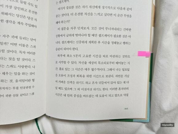 셀프케어는 신중하게 계획한 후 시간을 정해놓고 행하는 습관이 되어야 한다. 하루에 최소 5분의 고요한 시간을 따로 마련하는 것만으로 시작할 수 있다. 자신을 세상의 목소리로부터 떼어놓는 시간, 홀로 있는 그 시간은 매우 필수적이다. (중략) 이러한 혼자만의 시간은 내 안의 중심을 바로잡는 데 도움이 되고 앞으로 닥칠 바쁜 한 주에 대비해 나를 충전해 준다. 당신에게 혼자만의 시간은 어떤 형태일지 모르겠지만 당신 자신을 위해서 꼭 가져야 하는 시간이다. _306