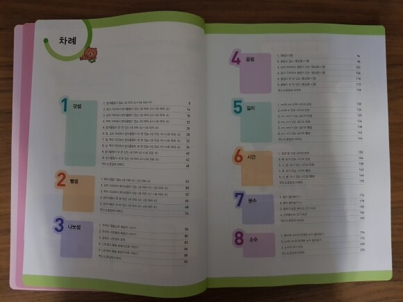 이렇게 덧셈, 뻴셈, 나눗셈, 곱셈, 길이, 시간, 분수, 소수의 8개의 큰 주제 아래 작은 주제 44개로 나누어서 체계적으로 학습할 수 있도록 되어 있습니다.