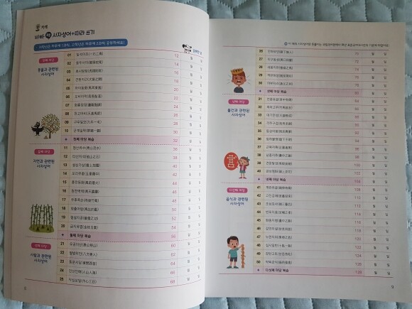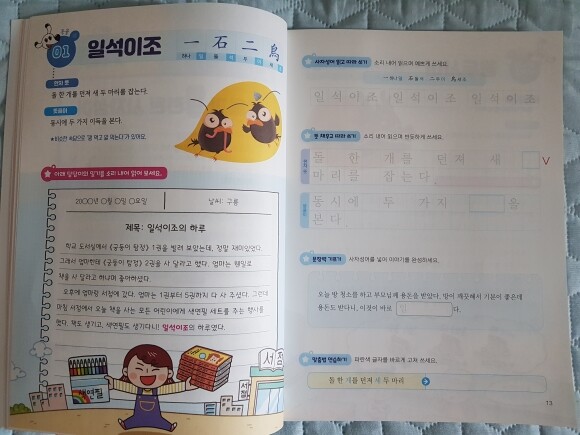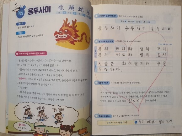 교재를 펼치지 사자성어와 함께 쓰이는 한자가 보여요.
