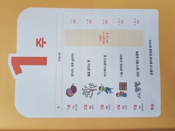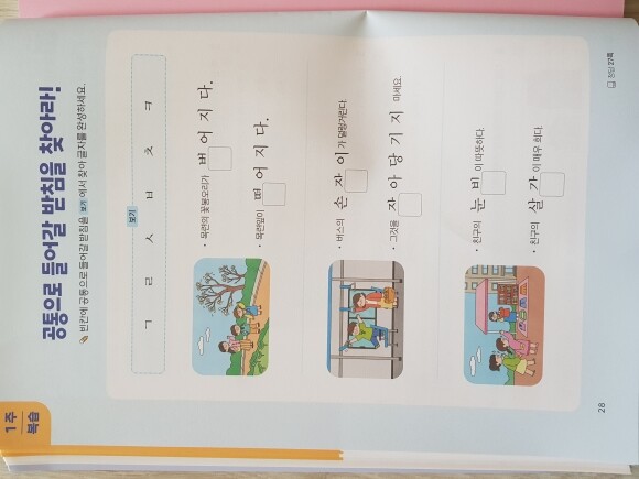 하루의 공부 시작하는 첫째장은 독해 전 학습 단계로 지문에 나올 내용을 그림으로 살펴봄과 동시에 공부할 주요 맞춤법 단어를 볼 수 있도록 했어요.