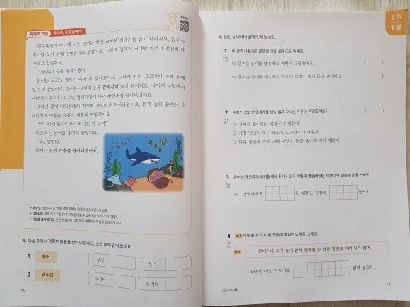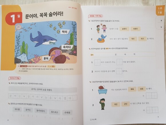 맞춤법+어휘+독해의 통합 학습으로 기초 문해력을 완성할 수 있다는 큰 장점을 가진 교재이지요.
