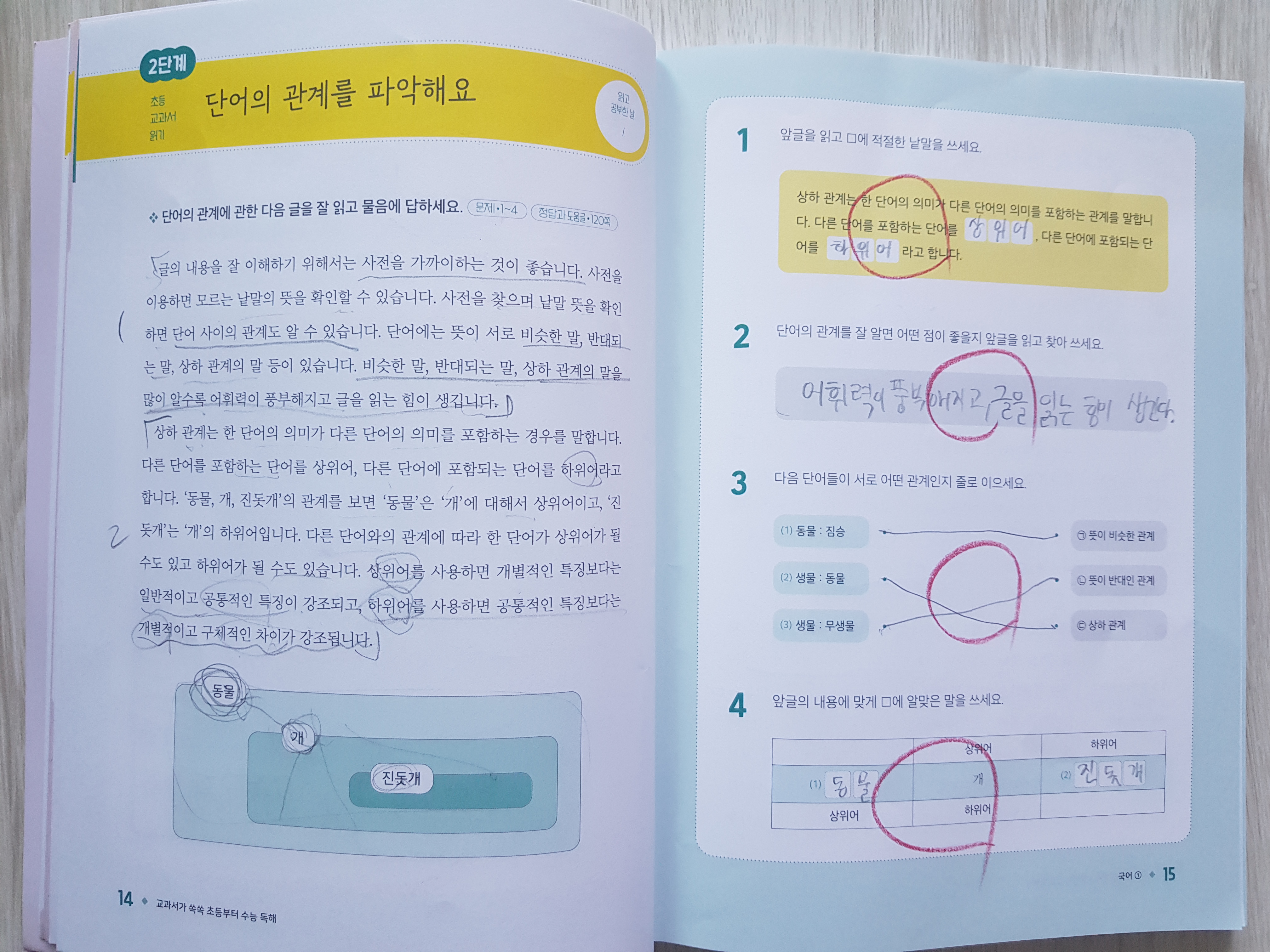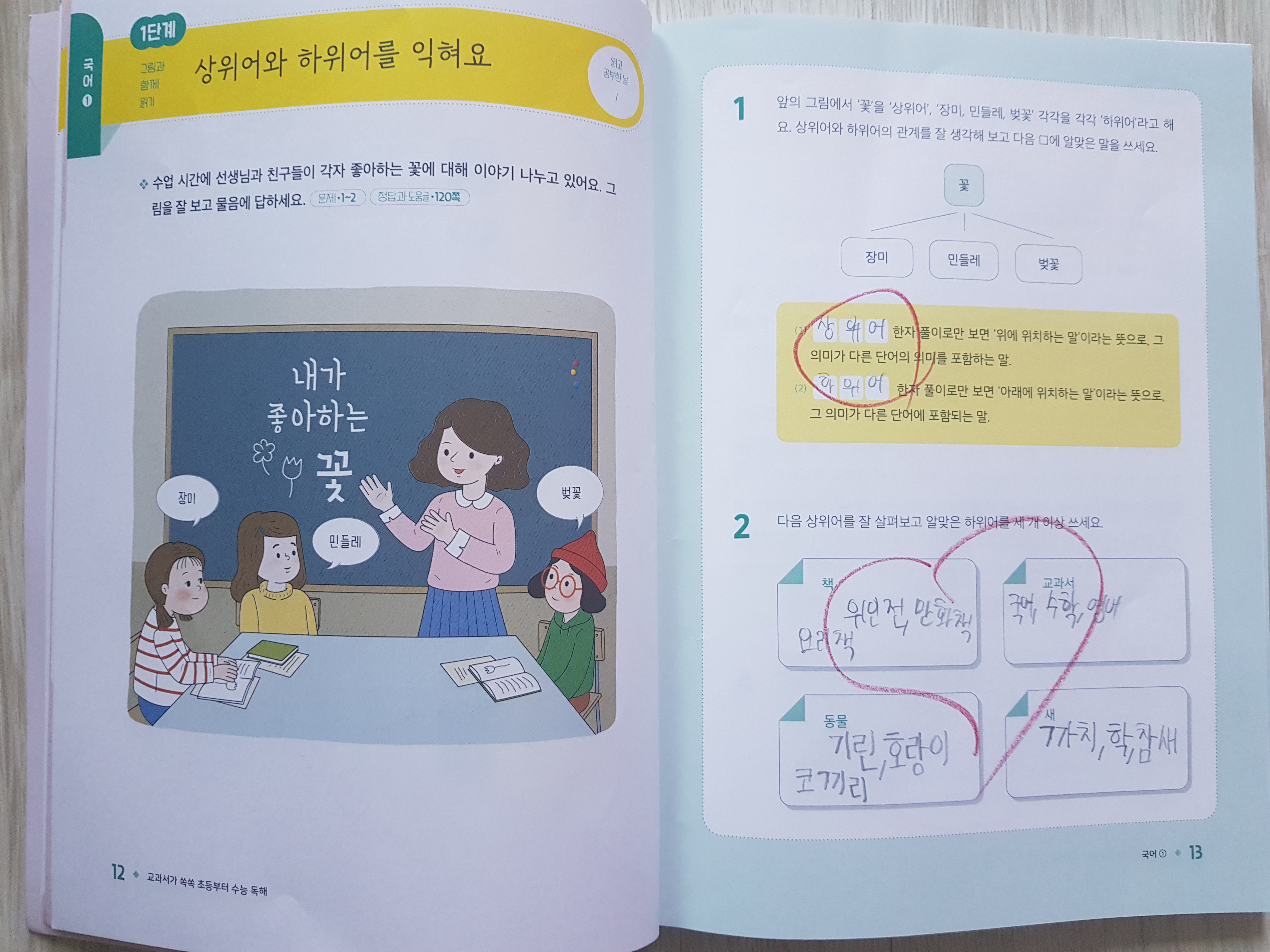 첫 번째 과목은 국어!아이가 풀어보는 것을 지켜보았어요.1단계 그림과 함께 읽기주제를 읽고 그림을 보고 있자니 흥미를 보입니다.사전에 대한 내용이라는 것을 알고 그림이 나타내고자 하는 것을 알아채고 문제를 통해 확인할 수 있네요.
