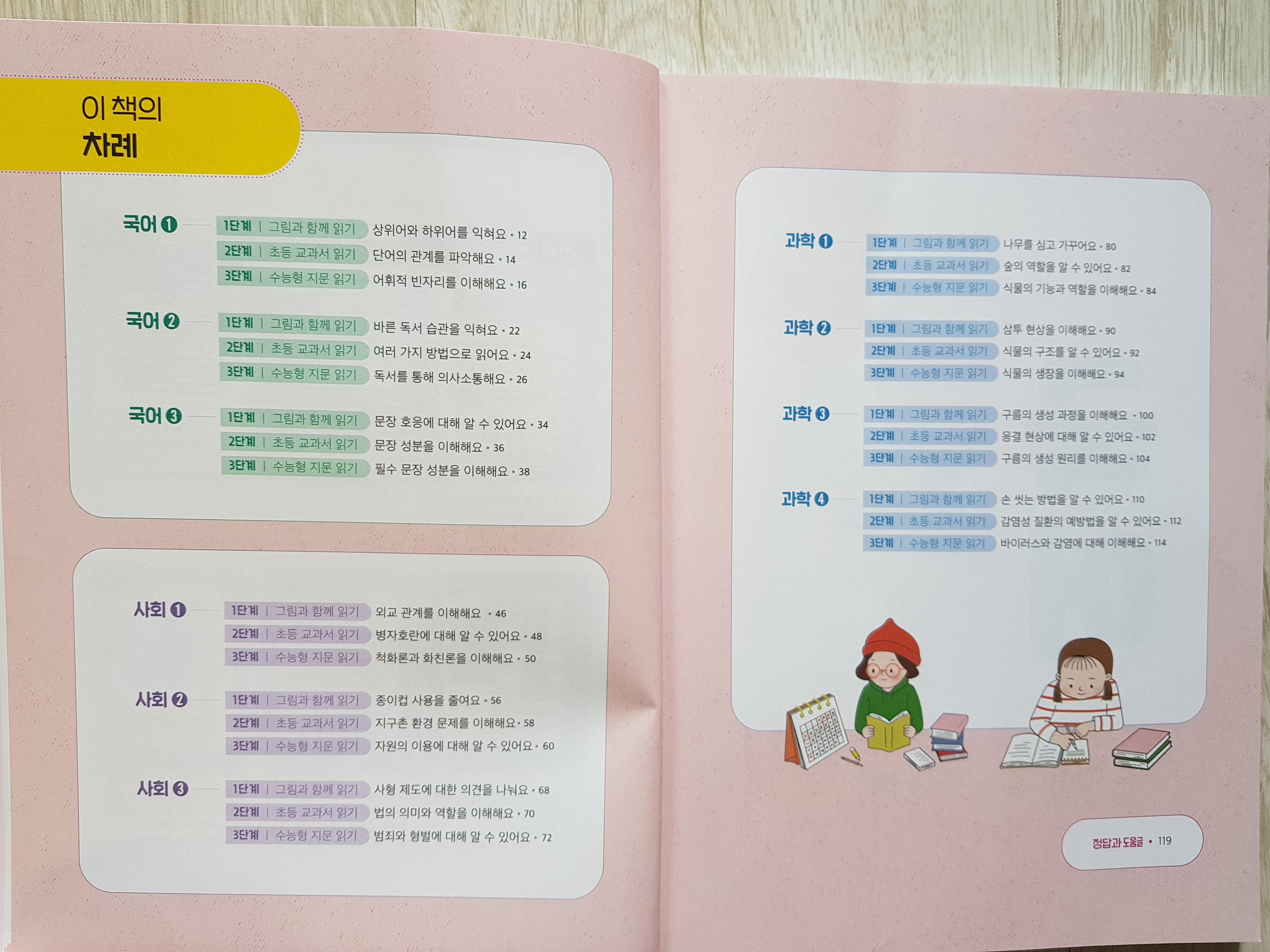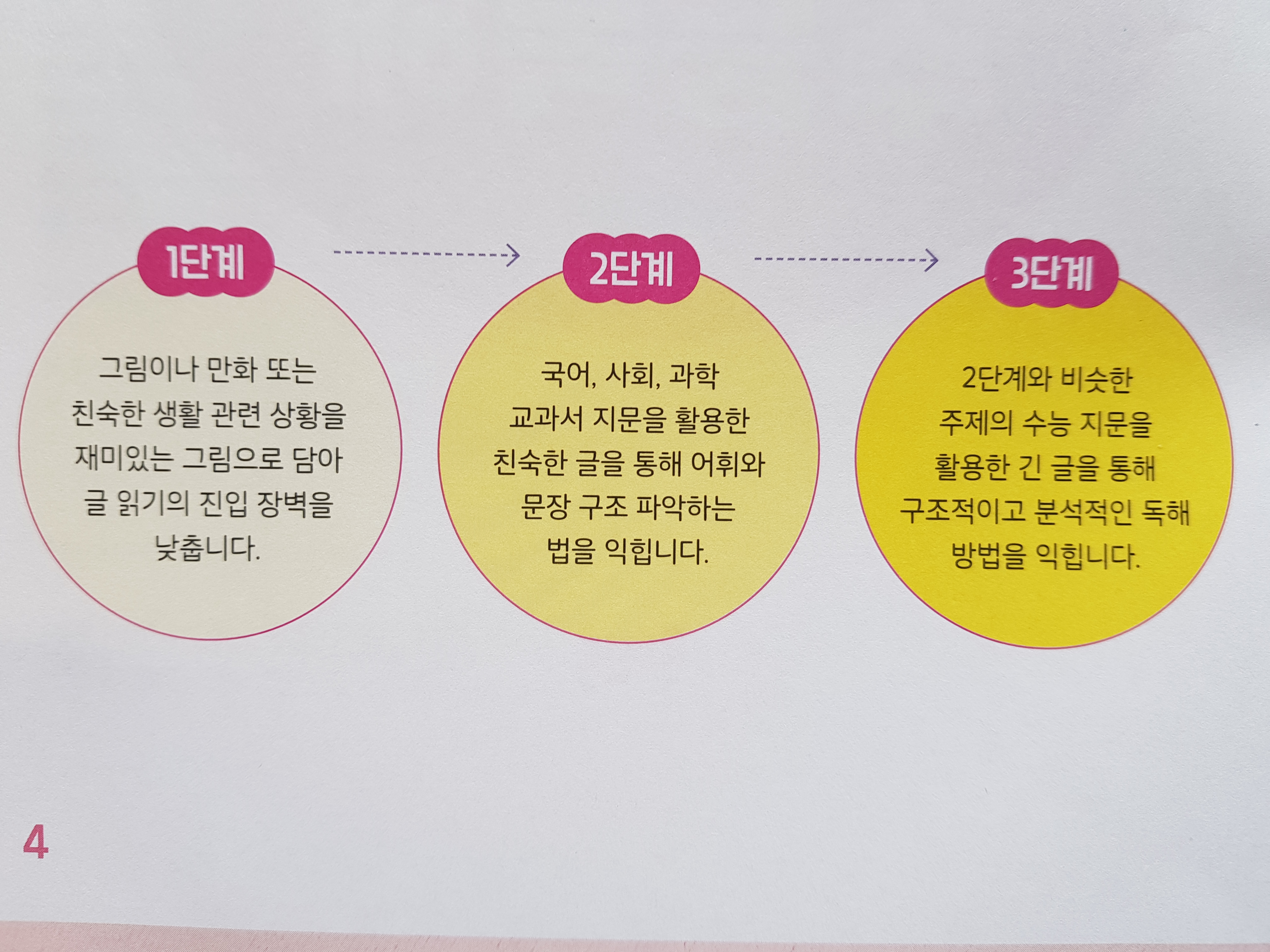 교재는 3단계 시스템 독해법으로 아이의 독서 능력을 키울 수 있도록 하고 있어요.1단계 그림과 함께 읽기 - 2단계 초등 교과서 읽기 - 3단계 수능형 지문 읽기