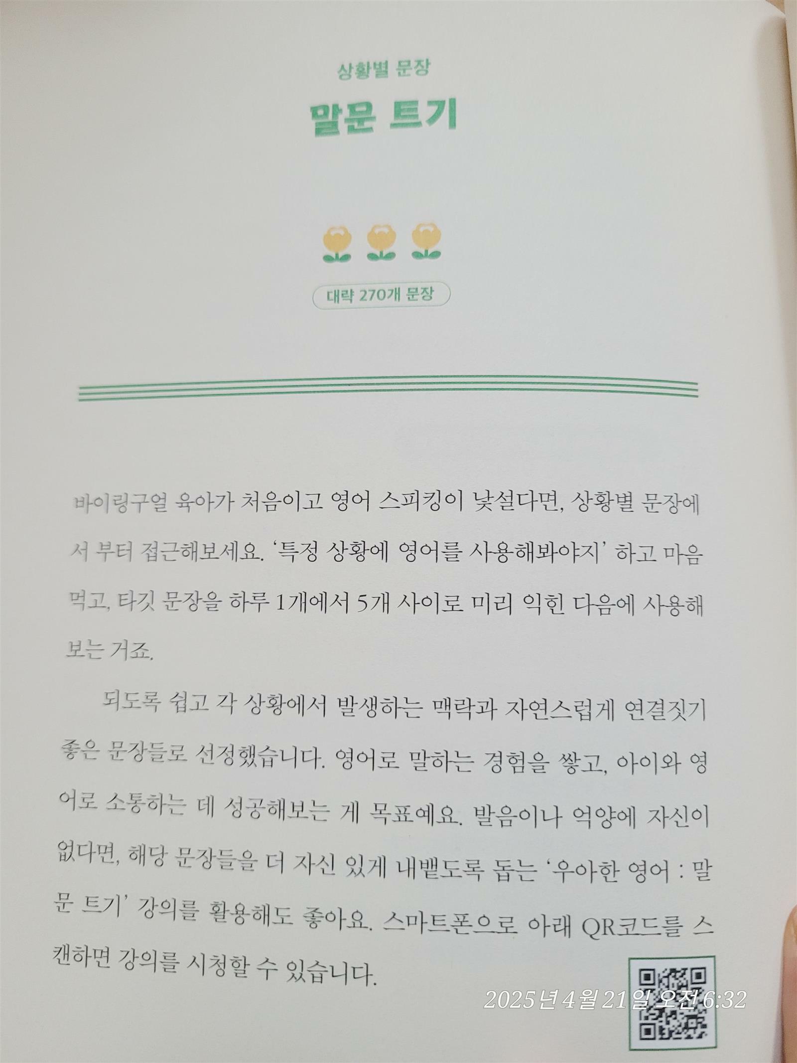 저는 별도의 학습 시간이나 교재 없이도 실천할 수 있는 현실적인 방법을 제시해줘서 좋았고 우리말이 트이는 시기에 영어를 잘하지 못하는 엄마도 ‘엄마표 영어’가 가능하다는 확신을 받고 싶었고 또 부담 없이 실천 가능한 팁이 가득하길 바랐어요.