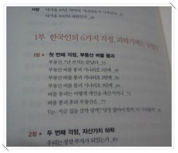 먼저, 1부에서는  부동산 버블 붕괴, 인플레이션에 따른 자산 가치 하락, 부채의 덫, 일자리 감소, 퇴직연금 붕괴, 세금 폭탄이라는 6가지 걱정의 원인과 대응 방법을 중심으로  소개하고 있다. 이어 2부에서는 미래를 지키기 위해 꼭 필요한  방패의 역할을 해주는 보험,연금 빚의 리모델링, 부동산 주식등 자산 리모델링, 소비생활 리모델링을 통해  불필요한 리스크를 빼고 빚부터 빨리 청산하고, 부동산에 올인하지 말고, 소비패턴을 합리적으로 바꾸어야 한다고 강조한다. 또한 소득효과, 좋은 투자효과, 꿈 효과 같은 3가지의 창역할을 하는것을 알려준다. 먼저, 소득효과를 위해서는 지식생산능력을 높이고 네트워크 생산능력을 키워야 하며 투자효과를 위해서는 3개의 통장시스템, 주거래 통장, 단기 목표 통장, 그리고 꿈 통장을 만들어야 한다. 그리고 마지막으로 꿈 효과를 보기위해서는 애초의 인생설계부터 반듯하게 해야한다고 당부한다. 특히 저자는 인구통계학적 문제에 주목한다. 베이비부머들이 은퇴하면서 성장에 제동이 걸리고 부동산 주식 등 자산시장도 침체에 빠질 것이라고 얘기한다. 주위에서는 1955년생인 베이비붐 1세대들의 은퇴를 하는 모습을 쉽게 볼 수 있다. 그들은 은퇴에 대해 대비가 부족한 모습을 보이고 있다. 대부분 미래에 대한 대비가 현실을 사는 각박함보다 후순위에 위치해 있었던 것이다.