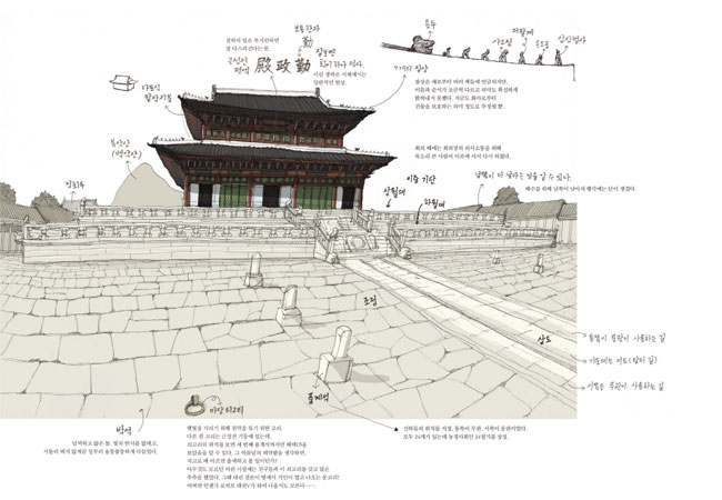 이 책은 도시 공학을 전공했고 뉴욕에서 일러스트를 공부한 이장희님이 경복궁, 명동 효자동, 광화문 광장 등 늘 우리곁에 있었던 장소에서 만날 수 있는 상징물들의 변화에 담긴 의미를 추리하고 일러스트로 그리고 그냥 지나치던 그 속모습에 대해 설명을 곁드린 스케치여행을 담고 있는 책이다.