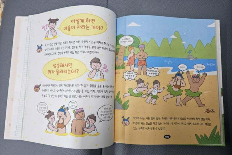 <질문으로 배우는 인성동화>는 옛날이야기를 통해 깨달음을 얻는 과정을 지켜보며 자연스럽게 "나라면 어떨까?"라는 질문을 스스로에게 던지게 됩니다. '생각해보기' 코너는 잠깐의 명상이 필요한 부분이지요. 저도 읽는 내내 저를 되돌아보는 시간을 가졌지요.