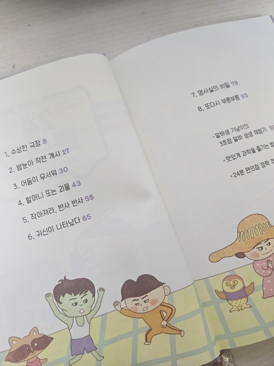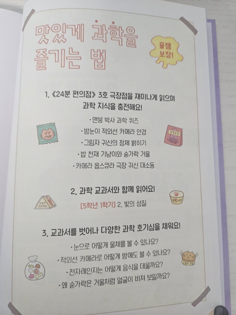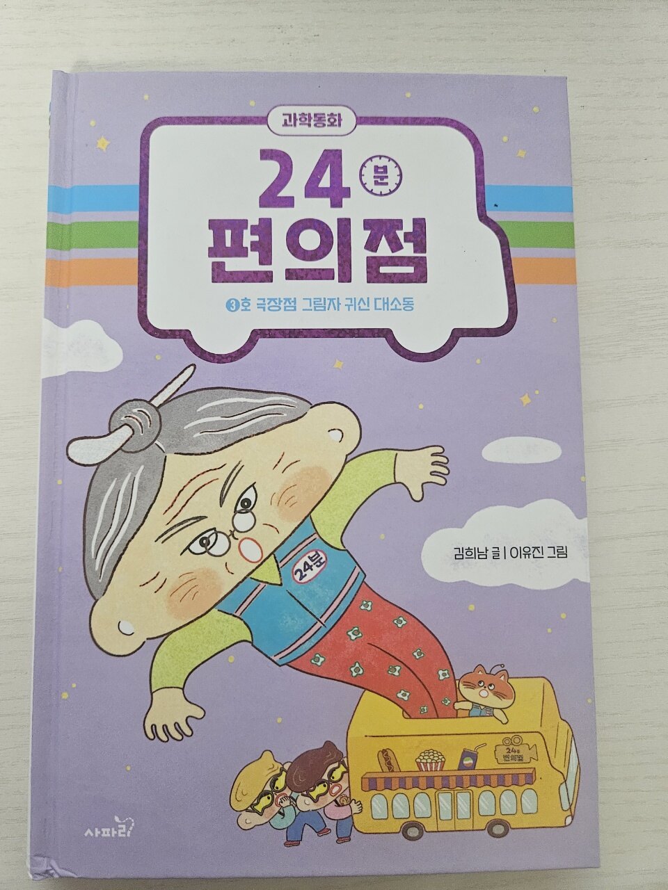 한적한 마을 극장 앞에 '24분 편의점'이 나타났어요. 24분 편의점은 그대로 24분만 딱 문을 여는 편의점이랍니다. 어느날 낡고 오래된 극장에 귀신이 나타나 아수라장이 되었는데요... 요즘 귀신이 있을까요? 정말 귀신인지 넘 궁금하지요?? 편사장과 기냥이가 해결해 나가는 극장 귀신의 정체를 밝히는 과정이 궁금하지 않으세요?? 극장 귀신의 정체를 밝히러 Let's go!!! 이번에 만나게 되는 장소는 오래된 극장이지요. 이제 할머니의 정체를 알고 있지요? 할머니 변장하여 24분만 여는 편의점을 운영하는 천재 미남 과학자 "편사장"과 기냥이 오랜만에 보니 넘 설레고 흥분이 되더라구요. 극장에 으스스한 공포 사건이 한바탕 일어나서 극장 문을 닫게 될 위기에 처하게 되는데요?? 이번에는 편사장과 기냥이가 어떻게 해결해 나갈지 넘 궁금하지요. 제목에서부터 으스스한 오싹한 달콤한 과학을 추리하는 편사장과 기냥이의 추리속으로 빠져들어보렵니다. 여기에 감초들의 등장!! 팥붕과 슈붕!! 붕어빵에 꼭 있어야 하는 팥과 슈크림 형제 팥붕과 슈붕의 얼렁뚱땅한 활약으로 감초같은 재미와 웃음을 주어서 배꼽을 잡았다라지요...ㅎㅎ 24분편의점에 쑥!!! 빠져들게 되는 재미!! 어느새 엄마도 아이도 모르게 함께 24분 편의점에 푹 빠져들었다는건 안비밀!! 극장점에서는 그림자와 렌즈를 통한 빛의 성질을 배우게 되는데요...?? 손전등을 비춰 그림자 놀이를 할 수 있고, 거울에 반사되는 모습을 비춰 볼 수 있어요. 빛의 성질을 통해 우리 눈으로 보여지는 허와 실!!! 착시현상과 현실의 차이를 과학적으로 알려주는 24분 편의점!!! 빛은 반사되기도 하고 굴절되기도 하고 헷갈리지요?? 숟가락 놀이는 아이들이 어렸을 때부터 이야기 해서 알지요?? 볼록 거울이나 오목거울의 특징, 차이점등을 알 수 있다지요. 카메라의 원리를 이용해서 귀신을 등장시키는... 과학적인 눈으로 해결함으로써 오싹오싹한과 통쾌함을 느끼지요. 24분 편의점의 부록!! 24분 편의점 깜짝 쿠폰 아시지요?? 24분 편의점에서 발급한 쿠폰으로 다양한 과학적 지식을 충전할 수 있어서 넘넘 좋았어요.. 이번 3호 극장점 그림자와 귀신 대소동에서 새로운 지식을 알아 갈 수 있어서 더 스릴만점!! 다양한 학년에서 배운 내용을 다시 한번 살펴 볼 수 있어서 좋은 과학동화!! 편사장과 기냥이가 재미있게 과학적인 설명을 해주어서 저학년 친구들도 읽기 편한 책이에요. 앞에 QR코드가 있어서 독후 활동 자료를 다운로드해서 활동까지 할 수 있어서 좋아요. 아이들과 함께 겨울방학에 24분 편의점 시리즈 함께 읽어보면은 좋을 것 같아요.