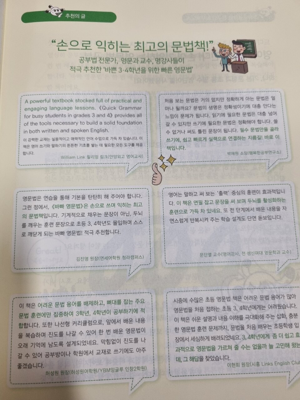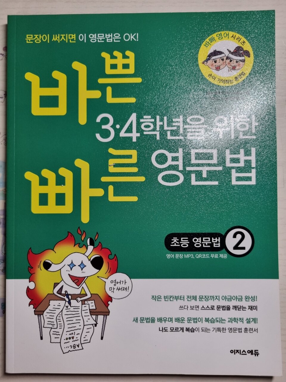 바쁜 3.4학년을 위한 빠른 영문법2를 공부중이에요. 1권에 이어서 열심히 하고 있는 4학년아이에요. 영어학원 안다니고 집에서 엄마표로 바쁜 시리즈로 영어를 하고 있어요. 바쁜시리즈는 영어라인이 넘넘 잘되어져 있어요. 아직 아이가 잘 따라가지 못하지만은 QR코드로 음원을 들을수 있어서 좋아요 쓰면서 익혀가는 영문법 처음에는 잘몰랐지만은 하다보니 쓰는것도 잘 하구있어요. 영단어도 척척 써내려가는 모습도 이해는 못하지만은 엄마와 읽으며 잘 하고 있어요. 기본문형과 초등 필수 영단어로 사용으로 딱이에요,. 쓰다보면은ㅇ저절로 깨닫게 되는 재미있는 마술같은 책이에요. 나두 모르게 척척 복습이 되어져 가는 치밀한 복습 설계의 교재.. 영어학원안다니는 다녀도 공부하기에 좋은 교재에요. 추천드려요.