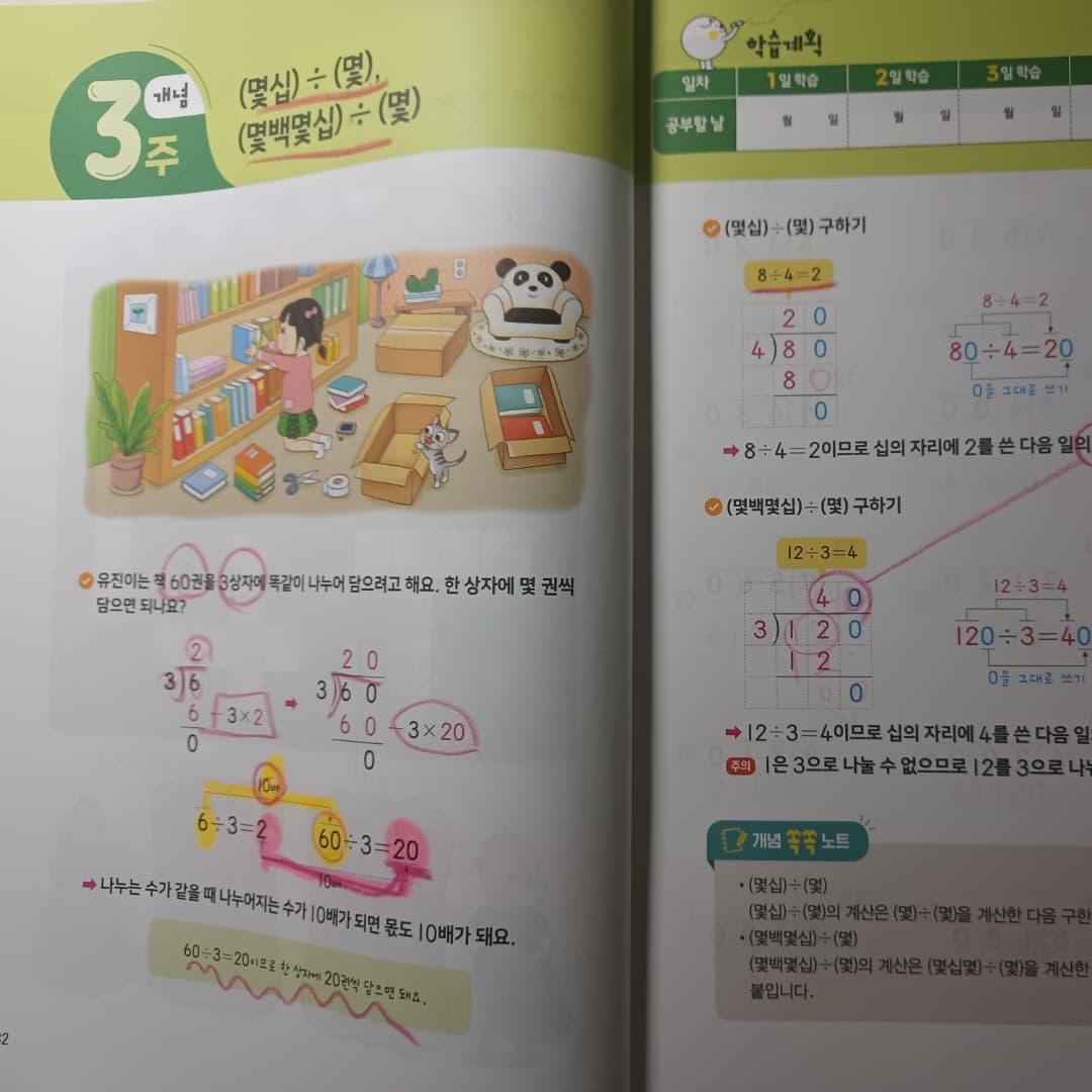 #광고#협찬 [1일10분 초등메가계산력]6권 -초등3학년 👉자연수의 곱셈과 나눗셈(2)/분수 #초등연산추천 으로 초등메가계산력을 추천하고싶다. 다른 연산교재들과 비슷하지만.. 🫐1일 10분공부 습관을 잡아주는 자기주도 학습력을 길러준다. 스스로 학습을 계획하고 계획한대로 실행,결과를 평가하는 과정에서 향상이된다. 매일 반복하여 훈련하다보면 주체적인 학습이 가능해지며 자신감으로 연결될것이다. 🫐1일 10분 시리즈의 3단계 학습 로드맵 1.학습계획하기 - 주 단위로 목표를 확인,스스로 계획하는 과정에서 자기주도학습력이 향상된다. 2.학습실행하기 - 1일10분 주5일 매일 일정량하면 기초가 탄탄하게 잡히고 습관이 형성된다. 3.결과평가하기 - 학습완료하고 계획대로 실행,진단하여 성취감과 자신감을 길러준다. 🫐책의구성 1.핵심개념 - 교과서 개념을 바탕으로 연산 원리를 쉽고 재미있게 이해할 수 있다. 2.연산연습과 반복 - 1일10분 매일 공부하는 습관으로 연산실력을 키울수 있다. 3.연산응용학습 - 생각하며 푸는 연산으로 계산원리를 완벽하게 이해할수 있다. 4.생각수학 - 한주 동안 공부한 연산을 활용한 문제로 수학적 사고력과 창의력을 키울수 있다. 아들과 함께 1주차 @ 계산결과가 세자리수인 (두자리수)*(두자리수) 개념정리를 잼있게 그림과 함께 설명을 해주어 이해하기가 쉬웠다. 학습계획을 하며. 다시 한번 개념을 쏙쏙 넣어주는 노트까지..개념정리에 좋은것 같다.👍 연습문제를 풀면서 시간도 한번 재어보며 풀었다. 1문제 실수를 했지만은 푸는데 집중하며 척척 푸는 모습이 대견했다. 1주차 마지막에 나오는 생각수학.. 사고력과 창의력을 가져다주는 잼있는 문제이다. 곱셈을 하면서 사다리타기하기.. 달력을 보면서 수영한 시간 구하기..응용되면서 잼있는것 같다. 아들과 함께 3주차 @(몇십)÷(몇) (몇백몇십)÷(몇) 나눗셈에 대한 개념정리를 그림 설명을 통해 볼수 있었다. 헷갈리지않게 주의하라는것 까지..설명ok 요즘 한창 나눗셈을 하는게 잼있어해서.. 풀어보았는데..척척 잘풀어나갔다. 아직 쉬운 단계여서 그렇지만..남아있는 #초등연산#메가계산력을 통해서..실력을 upup할수 있게 #자기주도적으로 #수학자신감생기게 꾸준히하자. 몇일동안 풀어보았는데..연산교재중에서 그림과 사고력&창의력까지 접목하는 연산교재는 처음보는것 같다. 💕초등저학년에게 좋을것 같아서 추천해주고싶다. 울집 둘째에게도 1권을 사서 풀려보아야겠다.. @megastudy_megamom 덕분에 서포터즈 활동을 할수 있게되어서 좋았다. 남은 교재로 잼나게 풀어봐야겠다. 💛메가스터디BOOKS 출판사로 부터 도서를 제공받아 작성하였습니다. #초등연산추천#초등연산#1일10분#초등수학#초등연산문제집추천#메가계산력#도서제공#광고#홈스쿨링#협찬#메가맘서포터즈#10기