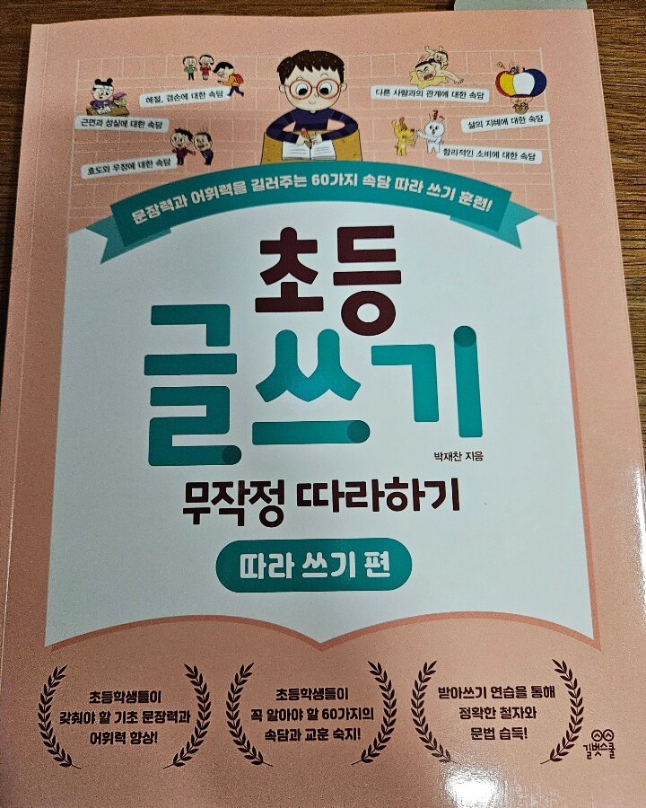 《초등 글쓰기 무작정 따라하기》 - 따라쓰기 편 📘박재찬 지음 📙길벗스쿨 ✅️문장력과 어휘력을 길러주는 60가지 속담 따라쓰기훈련!! ✅️초등학생들이 갖춰야 할 기초 문장력과 어휘력 향상 ✅️받아쓰기 연습을 통해 정확한 철자와 문법습득. 저희집에는 초5와 초3 두남매가 있답니다. 글쓰기를 정말 어려워하더라구요.. 문장을 구성하는 방법을 모르고,집중력이 부족해서 바른자세로 앉아 글을 쓰는걸 어려워하더라구요. 📌따라쓰기를 통해서 글쓰기를 시작하는게 좋아요. 올바른 문장을 따라 쓰며 문장의 구조와 내용을 머리에 익히면 비문을 쓰는 경향이 줄어들기 때문이다. 한글자 한글자 따라쓰는 경험이 집중력을 기르는데 도움을 준다고 해요. 어휘감각을 키우고 기억력을 높이는데 효과적인 방법이라고 해요. 📌세가지 힘 기르기 1. 주어.서술어.목적어.보어가 빠지지 않은 올바른 문장을 쓰는 힘 2. 다야한 단어를 알고, 그 뜻을 이해하는 힘 3. 따라쓰는 속담의 뜻과 그 속담의 교훈을 기억하는 힘 - 책의 구성을 보니 속담관련된 이야기를 삽화그림으로 표현되어져 있어요. 배울 속담과 숨은뜻까지 알수 있어서 좋은 것 같아요. -속담퀴즈풀기부분이에요. 일상생활과 어떻게 적용되는지 생각해 볼 수 있어서 좋은것 같아요.(생각의 힘up) - 속담과 숨은 뜻 따라쓰기 뜻도 알고 기초 문장력도 키울 수 있고. 예쁘게 바른 글씨를 쓰는 연습을 할 수 있어요. - 속담 속의 교훈완성하기 속담속의 교훈이 담겨 있는지 문장의 빈칸을 완성하면서 더 기억할 수 인어요. -받아쓰기부분 QR코드로 MP3를 이용해 음성을 듣고 받아기를 할 수있어요. 맞춤법과 띄어쓰기 등 익히고 글을 읽고 쓸 수 있는 능력을 키울 수 있어요. 1장 예절과 겸손에 대한 교훈이 담긴 속담 2장 근면과 성실에 대한 교훈이 담긴 속담 3장 효도와 우정에 대한 교훈이 담긴 속담 4장 다른 사람과의 관계에 대한 교훈이 담긴 속담 5장 삶의 지혜에 대한 교훈이 담긴 속담 6장 합리적인 소비에 대한 교훈이 담긴 속담 다양한 교훈이 담긴 속담을 공부하는데요. 아이들이 요즘 속담을 잘 모르더라구요. 따라쓰기하면서 속담도 배우고 그 숨은뜻까지 알아가면 독해문제 풀때 도움이 많이 될것 같아요. 차근차근 하나씩 속담과 속뜻을 공부해야겠어요. 총60개의 속담을 한달에 완성 시켜보려고 합니다. 아이와 함께 부지런히 달려보려합니다. 글쓰기 연습해야하는 친구들.집중력이 떨어지는 친구들. 초등학생 저학년뿐아니라 고학년 친구에도 좋을것 같아요. 받아쓰기까지해서 맞춤법과 띄어쓰기까지 일석삼조인걸요? 울친구들에게 추천해요..