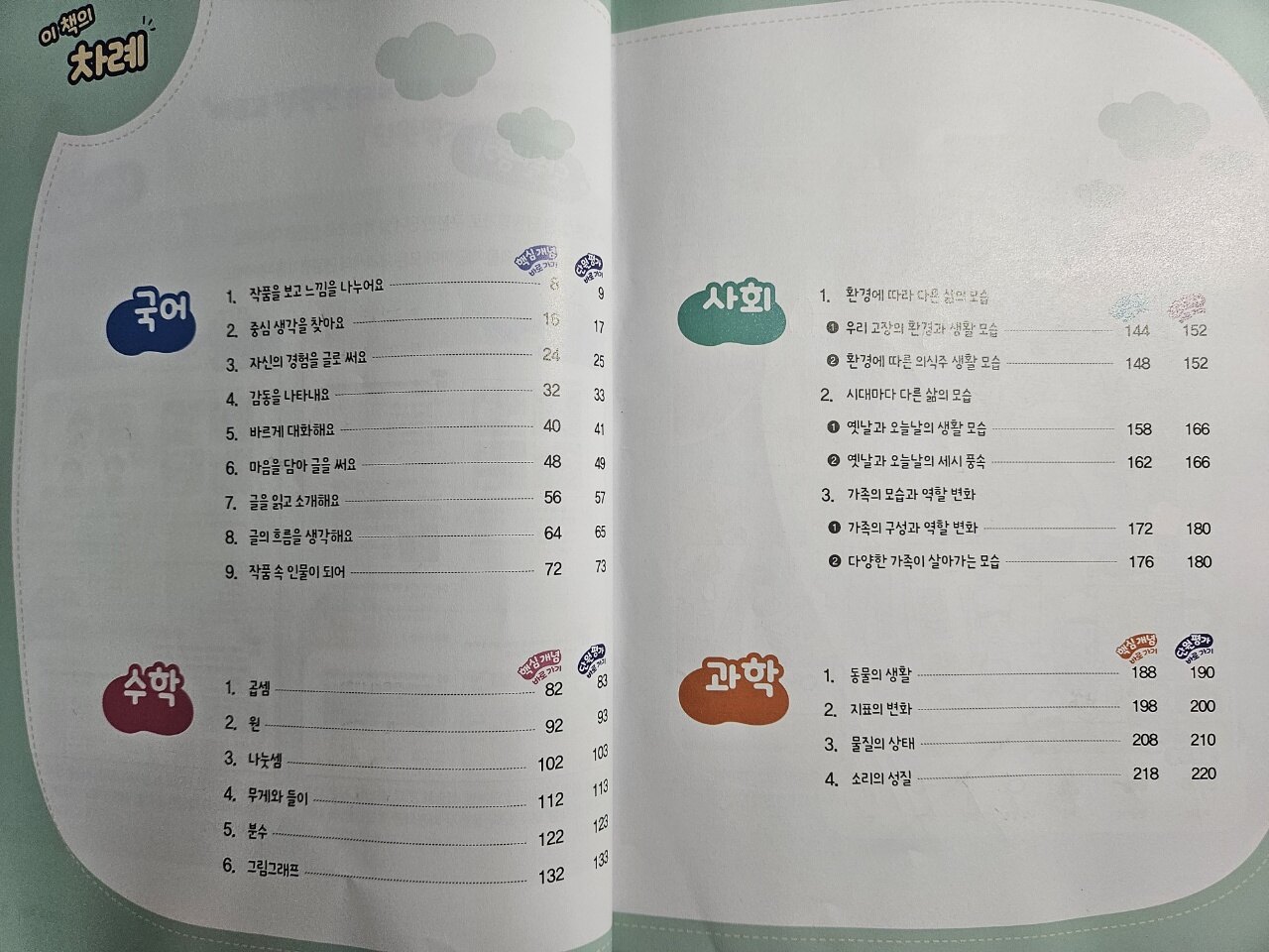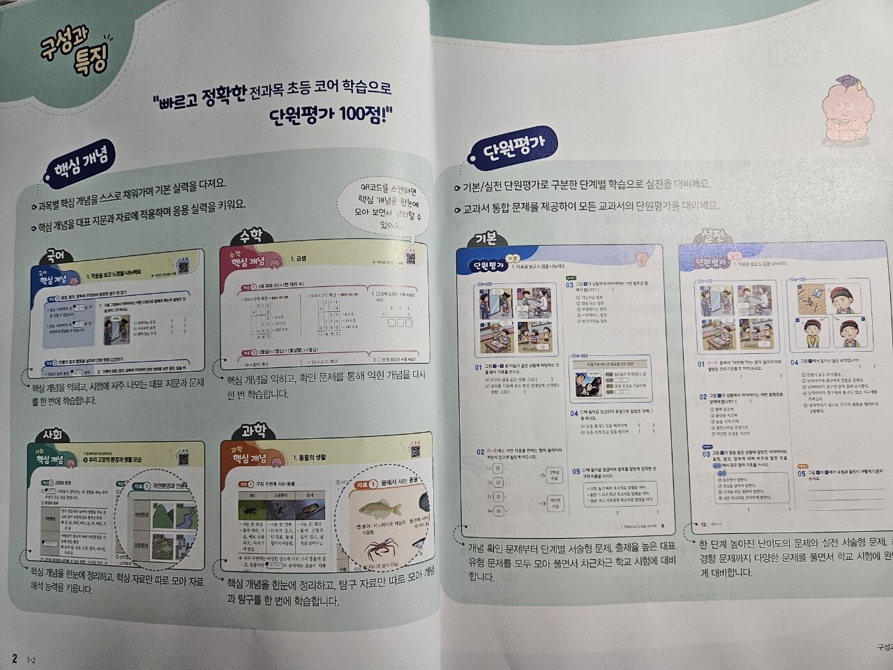 여름방학이 끝나고 2학기가 시작된지 일주일이 지났어요. 이제 학교에서 2학기 진도를 나가기 시작하고 있더라구요' 학교에서 단원마다 마치면은 단원평가나 수행평가, 쪽지시험을 보는 반들이 많더라구요. 학교 계획서대로 하는데도 있고 더 추가해서 해주시는 선생님들도 계세요. 울 공주네 반은 잘모르겠더라구요. 그래서 배우고 나면 단원별로 평가해보려고 합니다. 초코 전과목 단원평가로 아이들의 학습 부담이 조금이라도 덜어 줄 수 있어서 푸는데 좋은것 같아요. 구성과 특징 빠르고 정확한 전과목 초등코어학습으로 단원평가 100점 핵심개념 ✅️과목별 핵심 개념을 스스로 채워가며 기본 실력을 다져요. ✅️핵심개념을 대표지문과 자료에 적용하며 응용 실력을 키워요. 단원평가 ✅️기본/실전단원평가로 구분한 단계별 학슥으로 실전을 대비해요. ✅️교과서 통합문제를 제공하여 모든 교과서의 단원평가를 대비해요. 책의 구성은 국어.수학.사회.과학으로 이루어져 있어요. <국어> 학습을 시작하기전에 숨은그림찾기 아이들의 흥미와 관심이 생겨요. 단원별로 무슨 내용이 들어가는지 대단원을 확인할 수 있어요. 차근차근 공주 혼자서 개념&핵심내용을 잡아가고 문제를 풀어보았어요. 실전 단원평가도 잘풀어주었어요. 서술형이 조금 어렵게 느껴질수 있겠지만 지문을 읽고 앞뒤맞게 써놓았더라구요. 좀더 살을 붙여주면은 좋을것 같다고 이야기해주었어요. 실사 그림으로 나와서 공부하는데 도움이 되는것 같아요. 핵심정리부분을 잘 알아두고 빈칸에 들어갈 용어도 기억하기 좋을듯해요. 사회시간에 배울 내용을 한눈에 보기좋게 정리가 되어져있어요. 핵심용어는 잘찾아서 적어주며 단원을 훑어볼수 있어서 좋아요. 바른답.알찬풀이로 통해 엄마가 아이에게 도와줄수도 있지만 자기주도학습 하는 친구들이 스스로 공부후 채점하기에 편하고 해설까지 자세히 되어져 있어서 좋은것 같아요. 자기주도학습이 잘되어진 친구나 엄마표홈스쿨링 복습하는데 좋은 교재인것 같아 적극 추천드려요.