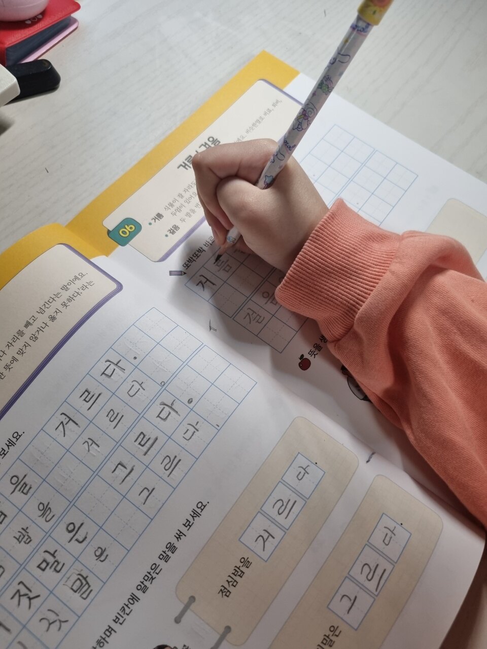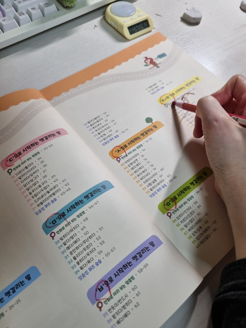 초등학교 3학년인 언니!! 공주님께서.. 이런이런~~~맞춤법이 어려워 지나봅니다. 어쩌면 좋을까요ㅋㅋ <또박또박 따라쓰기>시리즈 중 맞춤법을 선택해서 공부와 매일 한장씩 공부한답니다. 완북하려면은 오래 걸리겠지만은ㅋㅋ 잘하겠지요?ㅎㅎ 오늘까지 공부한 맞춤법.. 엄마도 살짝 헷갈렸던 부분이 있었다지요ㅋㅋ 가르치다 vs 가르키다 값 vs 삵 갔다 vs 같다 개발 vs 계발 거르다 vs 그르다 거름 vs 걸음 걷히다 vs 거치다 겨루다 vs 겨누다 결제 vs 결재 바꾸다 vs 고치다 다양한 맞춤법을 공부했다지요.. 내일도 쭈욱 함께합니다. (엄마는 덤으로 같이 공부한답니다.) 초등학생 저학년.고학년 상관없이 다양한 연령층 친구들이 하면은 좋을것 같아서 적극 추천드려요. 또박또박 따라쓰기 시리즈~~~다 좋답니다.