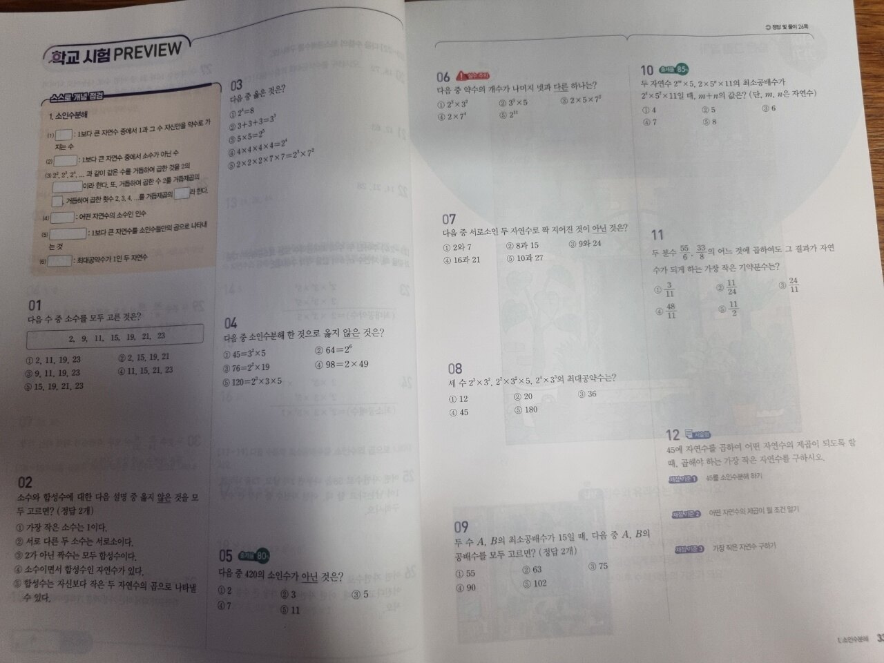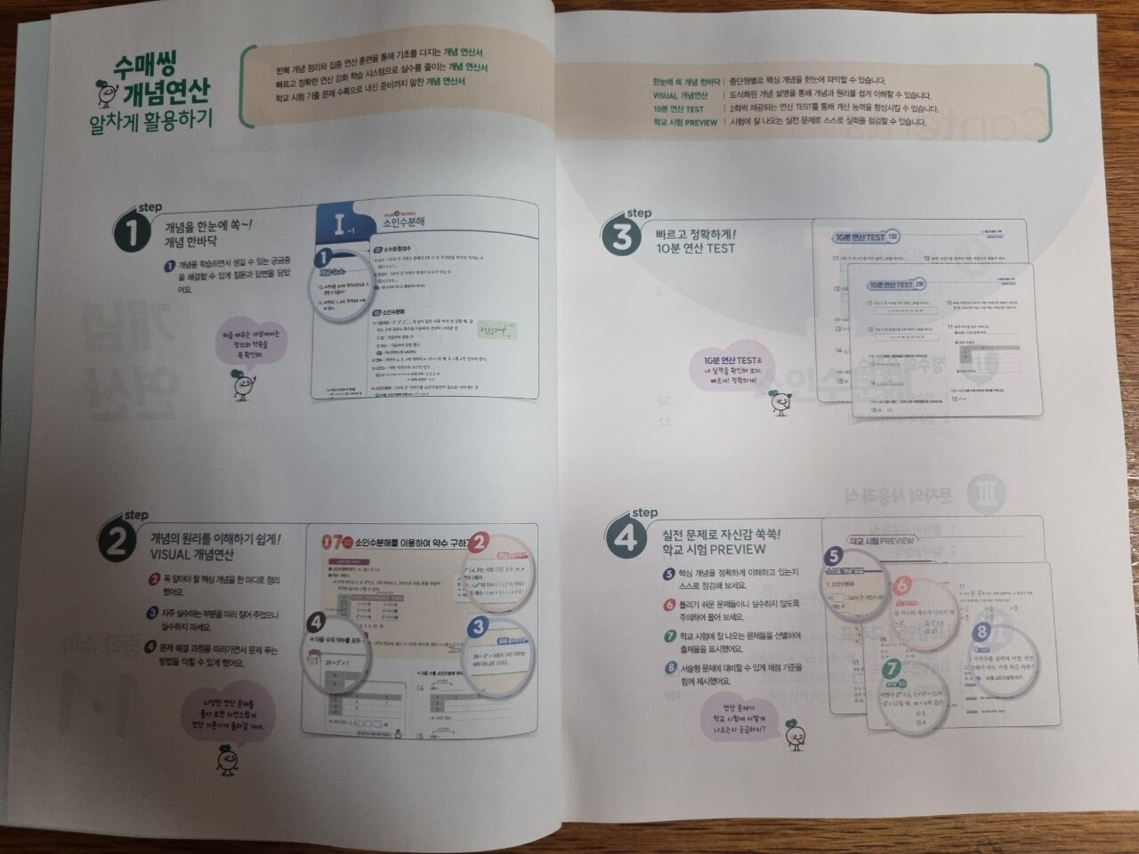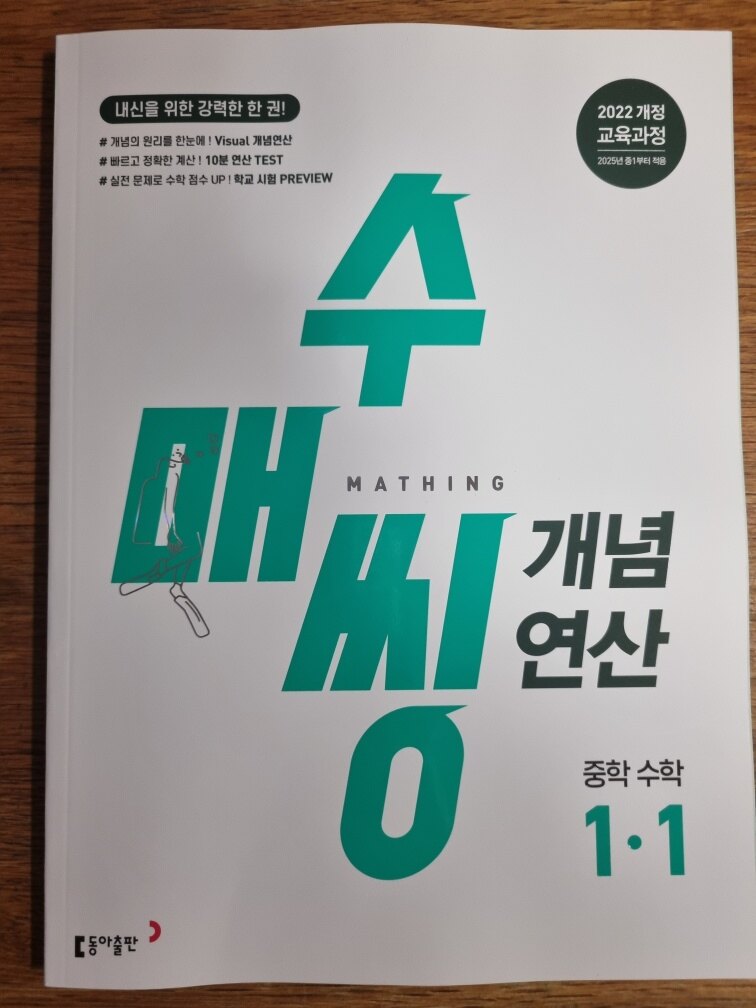 수매씽개념연산은 중학교 개념과 연산을 함께 공부하는 초등고학년,예비중에게 필요한 교재인것 같아요. 22년교육과정으로 25년 중학교 1학년에 적용된다고 해요. 중학교 수학을 제대로 시작하는 울친구들 내신을 위한 준비서!! 지금 아들은 초등5학년이지만 집에서 연산은 중등1학년 과정을 하고 있어서 도움이 될 것 같아서 좋은 기회에 수매씽으로 훑게 되어서 좋아요. 2022년 개정교육 과정을 반영한 교재 내년 25년 중학교 1학년부터 적용!! 수매씽 개념연산 알차게 사용하기!! 알맞게 자알~~~ 사용해보자!! 목차는 초등학교 연산에서 연계되어져 나오지만은 많은 부분이 다름을 알 수 있지요?? 하나하나 잘 해보아요!! (지금 배우는 부분은- 음수,양수부분을 공부하고 있는데 정수와 유리수 파트겠지요??) <소인수분해> step1. 개념을 한눈에 쏘옥~~~ 개념 한바닥 처음 배우는 내용을 약속해고 정의해주는 부분!! 초등과 다르게 자세한 내용들 하나하나 익혀나가야 하는부분이네요. 한눈에 볼수 있어서 좋은 것 같아요. 내용 익혀서 풀어 봐야겠어요. step.2 개념의 원리를 이해하기 쉽게 VISUAL 개념 연산 꼭 알아야 할 핵심 내용을 한마디로 정리해주고, (도식화된 개념정리) 자주 실수하는 부분을 짚어주며 문제 해결과정을 따라가면서 문제를 푸는 방법을 알려준다. step.3 빠르게 정확하게 10분 연산 TEST 10분 연산은 내 실력을 확인 할 수 있는 부분이다. 연산부분에서 실수가 있지 않는지 꼭~~ 짚어보고 갈 수 있어서 좋아요.. 실수없는 연산을 위해서 시스템강화!! 자연스럽게 연습할 수 있는 문제들로 수록!! 차근차근 진행해보자. 시간을 제한을 두고 집중해서 풀어보자. 초등 5학년 아들도 요즘 이리 공부하고 있어요. 꾸준히 하면은 중등가서도 할수 있겠지요?? step.4 실전문제로 자신감 쑥쑥 학교 시험에 잘 나오는 부분을 선별해서 출제율도 표기되어져 있고, 서술형 문제에 대비할 수 있는 좋은 문제이다. 핵심부분의 내용을 정리할 수 있는 부분이 있어서 점검이 필요하지요. 시험 대비에 Good인것 같아요. 쉬어가는 코너 숨은그림찾기~~ 잠시 숨쉴틈이 있지요? 머리를 식혀보아요!! 정답풀이집도 QR코드가 있어서 빠르게 찾아볼수 있어서 좋은것 같아요. 저 QR코드를 교재앞에 붙여 놓아도 좋을것 같아요. 중등수학 개념과 연산 두가지를 한번에 잡을 수 있는 좋은 기회지요. 예비중등, 선행하는 친구들에게 두마리토끼를 잡을 학부모님들에게 적극 추천드려요.