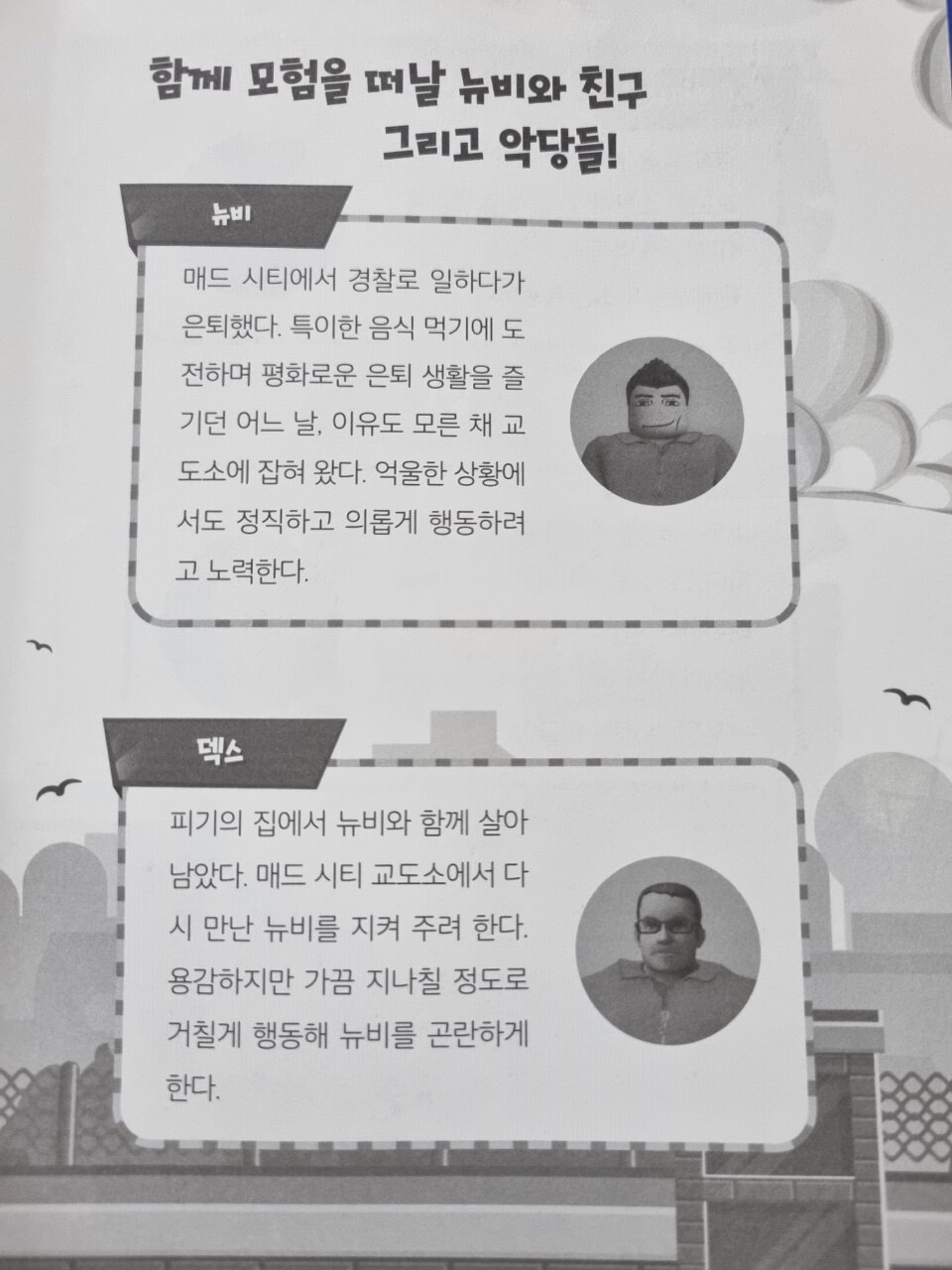 [아이들이 좋아하는 로블록스] 게임만으로 즐기던 로블록스 상상력 키우는 동화로 만나게 되었다. 게임을 책으로 즐길수 있는 마력!!! 빠져드는 아이의 모습이 신기하게 느껴졌다. 매드시티 감옥을 탈줄하는 뉴비의 모험이야기 마치 영화의 한장면같은 재미있는 모험이야기가 기대된다. 재미와 상상력을 키우고 학교. 친구와의 교우관계를 경험할수 있는 공감되는 내용으로 우정.의리.협동심 사회성등을 기를수 있고 배울수 있어서 좋다. 첫페이지부터 게임 공략법이 나와있어서 더 흥미롭게 다가갈수있어서 책을 거부하는 아들도 재미있게 읽을수 있는 글밥있는 책이다. 쉽게 접할수 있어서 책읽는데 도움이되는 좋은 뉴비의 로블록스모험일기이다. 가상세계에서 만나는 나만의 세상에서 만들고 같이 게임하는 로블록스의세상!! 아이들이 좋아하고 열광하는 로블록스 친구들에게 추천해주고 싶어요..