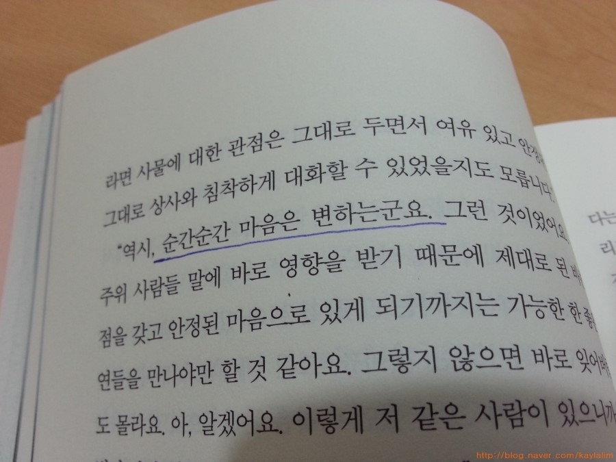 사람의 마음은 매순간 변하는 것입니다. 이런 사실을 깨달아야지 지금 내 마음이 왜 그런지를 이해하고, 상대방이 왜 그런 말을 하는지를 이해할 수 있는 것 같아요. 책을 읽을때에는 고개 끄덕이며 다 알지만 실생활에서 실천하기에는 스스로의 수양이 더 필요할 듯 싶네요...ㅎㅎㅎ