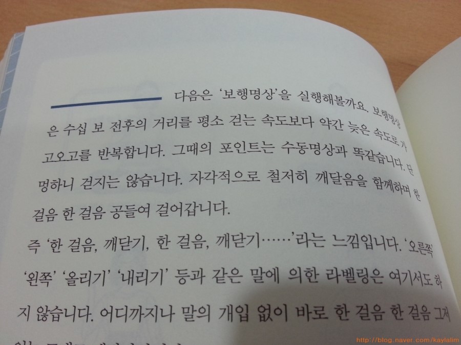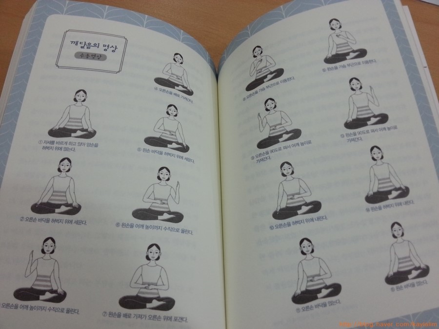 책의 뒷쪽에는 명상하는 방법에 대해서 설명과 이렇게 그림으로 나와있어요. 천천히 따라하면 쉽게 명상법을 익힐 수 있을 거예요. 하지만, 저는 이런 정적인 명상보다 아래의 보행명상이 더 좋습니다..^^ 그래서 이번 주말에는 보행명상 방법을 다시 한번 읽어보고 실천해 볼려구요.