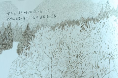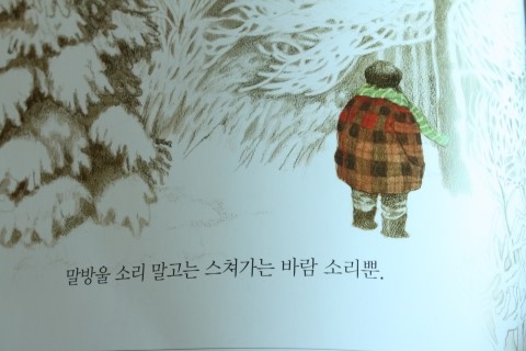 때론 장황한 몇 페이지의 글보다 함축적이지만 간결한 글 몇줄이 가슴을 더욱 울리기도 합니다.  저는 오늘  18줄의 글과 17편의 그림으로 마치 하얀눈이 소복이 쌓여가고 있는 숲가에 서서 행복한 마음으로 눈을 맞이하는  상쾌하고 행복한 그 기분을 만끽할 수 있는 그림책을 만났습니다.  분명 행운입니다.  글과 그림만으로 어린시절에나 느낄 수 있었던 행복감을 맛볼 수 있다니요.  오래도록 제 곁에 있어줄 책 <눈 내리는 저녁 숲가에 멈춰 서서>(살림어린이, 2013).