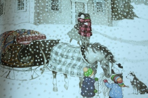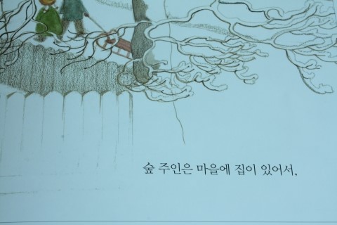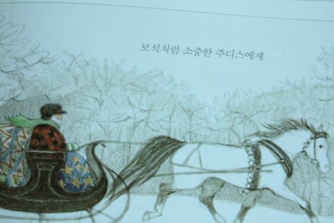 글은  '보석처럼 소중한 주디스에게'로 시작됩니다.  그리고 나이 지긋한 농부가  어둠이 내려 앉는 눈 내리는 겨울 숲가에 멈춰섭니다.  나이든 농부는 눈 내리는 겨울숲의 아름다움에 흥겨워 그만 눈밭에 펄쩍 드러누워  행복한 얼굴로 겨울 숲을 만끽합니다.  하지만 농부와 함께인 어린 말은 농부의 기쁨을 알리가 있을까요.  그저 방울만 딸랑일 뿐입니다.  그리고 숲엔 말방울 소리 말고는 스쳐가는 바람소리뿐입니다. 하지만 농부는 이 겨울숲에 욕심부리지 않고 가던 길을 마저 떠납니다.