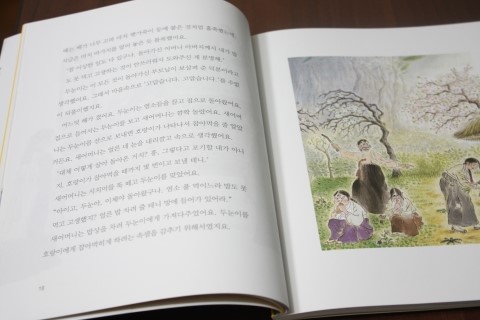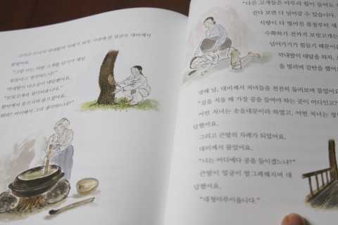 그리고   베 짜는 큰딸 베 매기는 작은 딸이란 이야기는 부모의 입장에서는 열손가락 깨물어서 안아픈 손가락 없다라고 생각하지만 자식의 입장에서는 사랑의 차이를 느낄 수 있다라는 메세지도 읽어낼 수 있어서 엄마인 제게도 깨달음을 준 이야기입니다.  이 이야기도 마음씀이 이쁜 작은딸은 결국 복을 받게된다는 메세지를 전합니다.  그리고  평소 '베를 짜다'라는 표현을 익히 알고 있었지만 '베를 메다'라는 표현은 처음 들었는데요 사전을 찾아보니 베를 매기다는  '베를 짜려고 날아 놓은 실을 매는 일'이라고 되어 있더군요. 옛 조상들에게 중요한 일중 한가지였을 베짜는 일과 관련된 용어를 새롭게 알게된 계기가 되기도 했습니다.