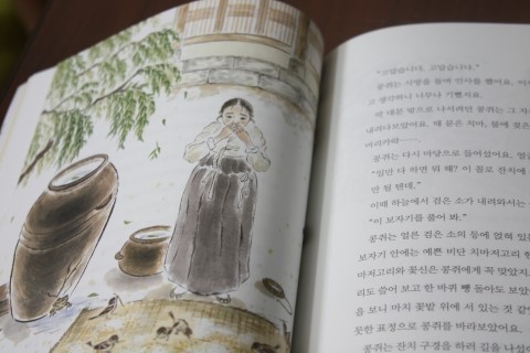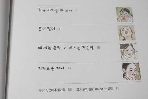 책은  모두 네편의 단편으로 이루어져 있습니다.  황금 사과를 딴 소녀, 콩쥐 팥쥐, 베 짜는 큰딸 베 매기는 작은 딸, 지혜로운 처녀 등 모두 자매의 이야기를 다루고 있습니다.   네편의 이야기 모두 흥미롭고 재미있지만 그중 베 짜는 큰딸 베 매기는 작은 딸이란 이야기와 콩쥐 팥쥐 이야기가 흥미롭더군요. 콩쥐 팥쥐 이야기는  이미 알고 있는 내용이겠거니 했는데 막상 읽어보니 우리가 알고 있는 내용으로 끝나는 것이 아니었습니다.  선한 마음을 쓰던 콩쥐는 결국 사또의 부인이 되었는데  그 모습을 배아파한 팥쥐가 결국 콩쥐를 연못에 떠밀어 죽이고 맙니다. 그 후 콩쥐는 연꽃으로 되살아나 사또에게 자신의 상황을 알립니다.  그리고 해피앤드 결말을 맺습니다.