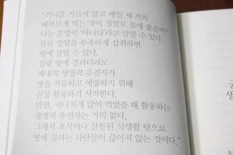 많은 양의 음식을 먹고 포만감을 느끼고 또 필요이상 축적된 지방을 제거하기 위해 운동하는 어리석은 삶을 살지 않으려면 배속에서 '꼬르륵'소리가 나는 것을 즐기고 일찍 자고 일찍 일어나고, 많이 걷되 적게 먹으면 장수유전자인 시트루인 유전자가 활성화되어 두뇌활동과 신체건강이 최적상태에 이른다고 저자는 주장합니다.  또 저자는 우리몸이 음식을 받아들여 일정부분 소모하고 저장하는 원리등을 포함 우리몸의 인체시스템을 의학지식을 바탕으로 상당히 설득력 있게 제시하고 있어서 책을 읽는 동안  몰입해서 즐겁게 읽혔습니다.  더군다나 저자도 한때 비만으로 힘들었던 시기가 있었고 그 후 1일 1식을 실행하며 몸무게를 서서히 줄여나갔고 더불어 다른 신체기관및 외모도 젊어지는 효과를 보았기에 더욱 설득력 있게 다가오네요.  의학적 지식과 자신의 체험이 녹아들어간 생생 체험기라고 말 할 수 있을것 같습니다.