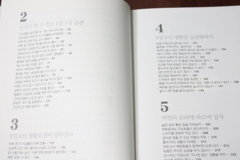 저자는 <1일1식>을 통해 젊고 건강하게 살 수 있는 비결은 적게 먹고(1일1식), 완전 식품(통째로 먹고)을 섭취하고, 먹으면 바로 자라(수면의 중요성)고 합니다.  이 외에도 구체적인 방법들이 제시되지만 저자가 제시하는 방법들의 원론을 들여다보면 '동물처럼 행동하고 동물처럼 먹어라'라고 해석되는듯 합니다.  동물들은 절대 과식을 하지 않지요.  배가 고프지 않는데 쓸데없이 사냥하지 않고 목마르지 않는데 물을 마시지 않고 과식한후 살을 빼기 위해 억지로 운동하지 않습니다.  말그대로 배고프면 그때 필요한것을 섭취하고, 목이 마를때 마시고, 그저 살기 위한 움직임만 한다는 것입니다. 상당히 설득력 있게 다가왔어요.  '자연을 거스르지 말고 자연 그대로를 받아들이라'라고 받아들일 수 있을것 같습니다.